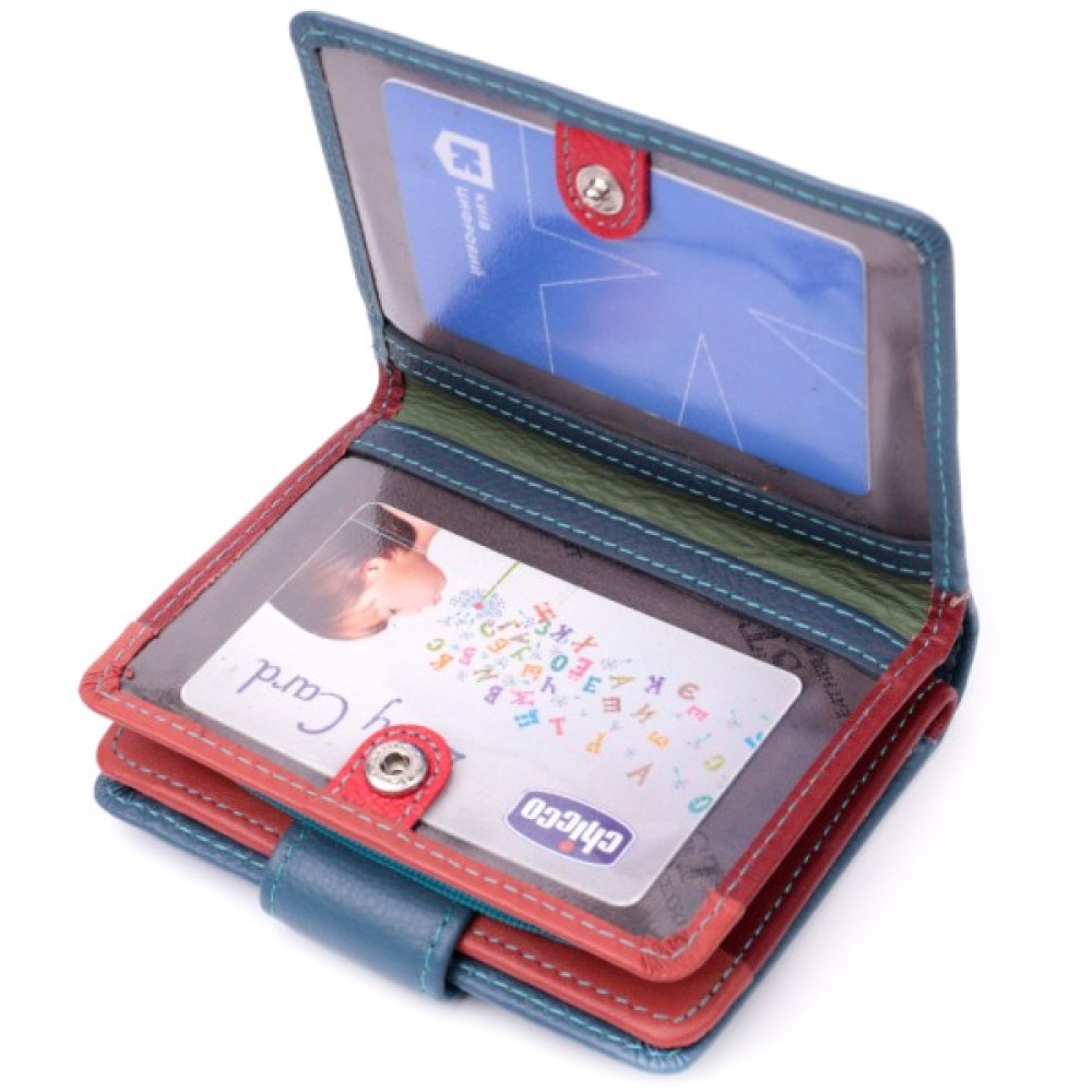 Гаманець бірюзового кольору зовні та різнобарвний усередині, що виглядає стильно та сучасно.