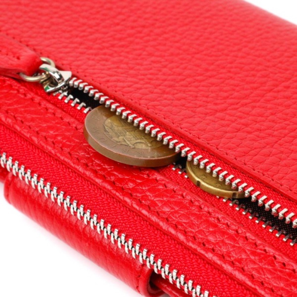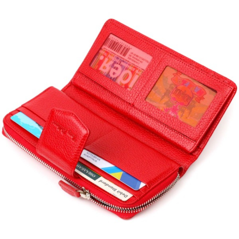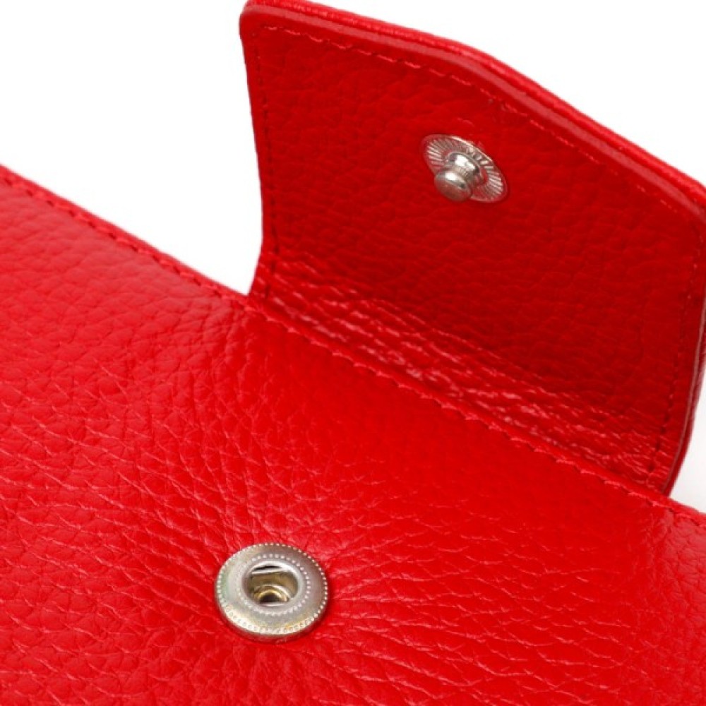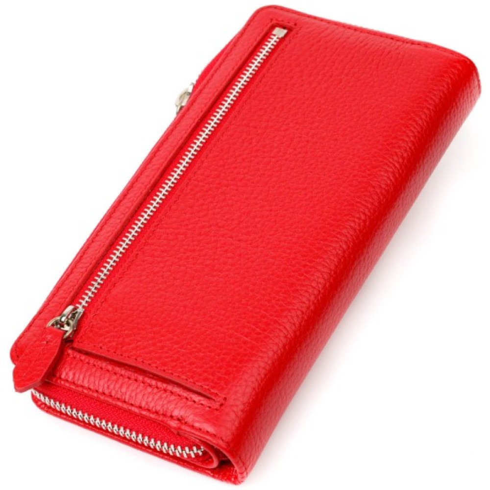 Яскравий жіночий гаманець із натуральної шкіри флотар, для якої характерна міцність, зносостійкість та зерниста фактура. Аксесуар складається з одного місткого основного відділення з кишенею-перегородкою на блискавці, монетниці, тринадцяти осередків для пластикових карток, двох прилеглих кишень та трьох відділень під сіточкою для документів. У виробі використано якісну фурнітуру сріблястого кольору. Закривається гаманець на блискавку – основне відділення, та на хлястик з кнопкою – блок для карт. Покупаючи цей шкіряний гаманець собі або на подарунок, ви отримуєте якісну та стильну річ, яка прослужить вам не один рік.