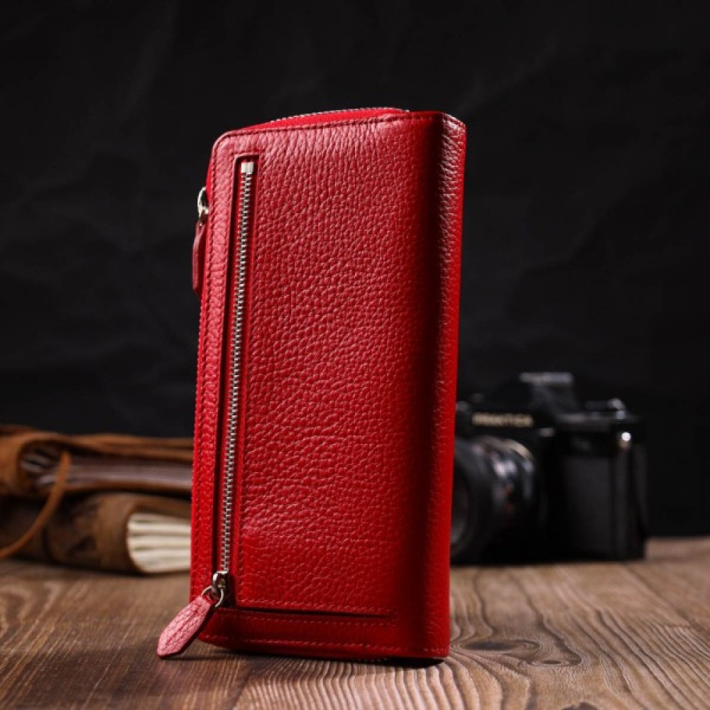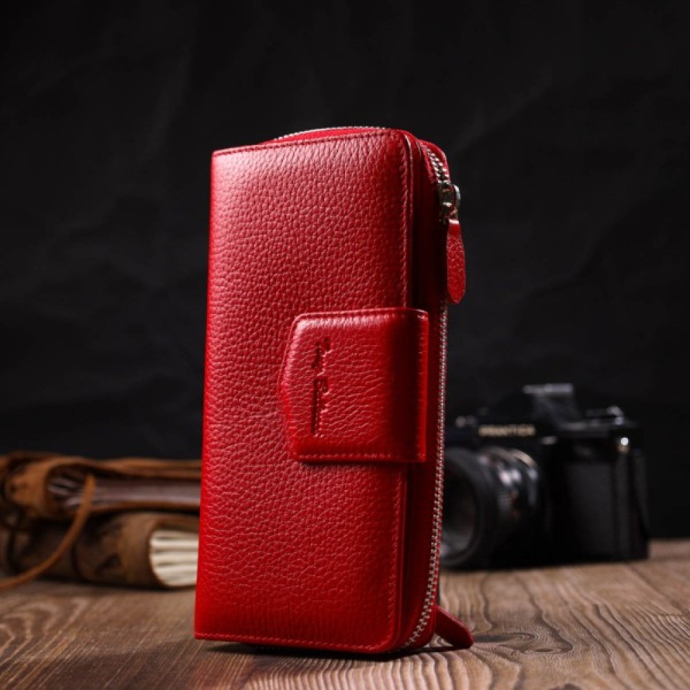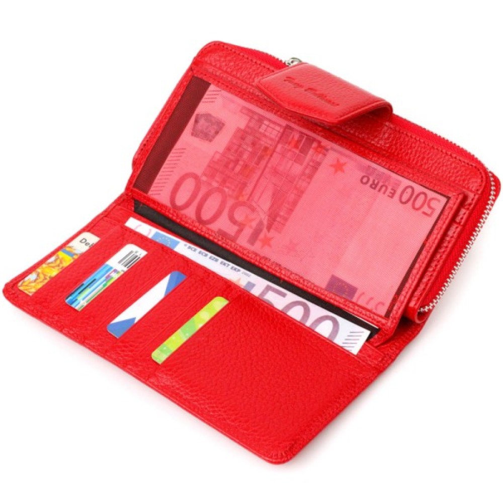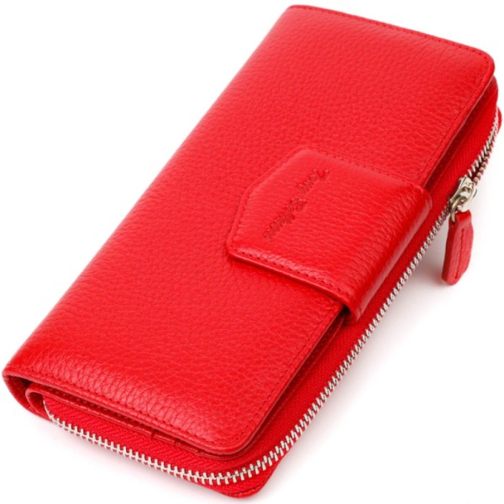 Яскравий жіночий гаманець із натуральної шкіри флотар, для якої характерна міцність, зносостійкість та зерниста фактура. Аксесуар складається з одного місткого основного відділення з кишенею-перегородкою на блискавці, монетниці, тринадцяти осередків для пластикових карток, двох прилеглих кишень та трьох відділень під сіточкою для документів. У виробі використано якісну фурнітуру сріблястого кольору. Закривається гаманець на блискавку – основне відділення, та на хлястик з кнопкою – блок для карт. Покупаючи цей шкіряний гаманець собі або на подарунок, ви отримуєте якісну та стильну річ, яка прослужить вам не один рік.