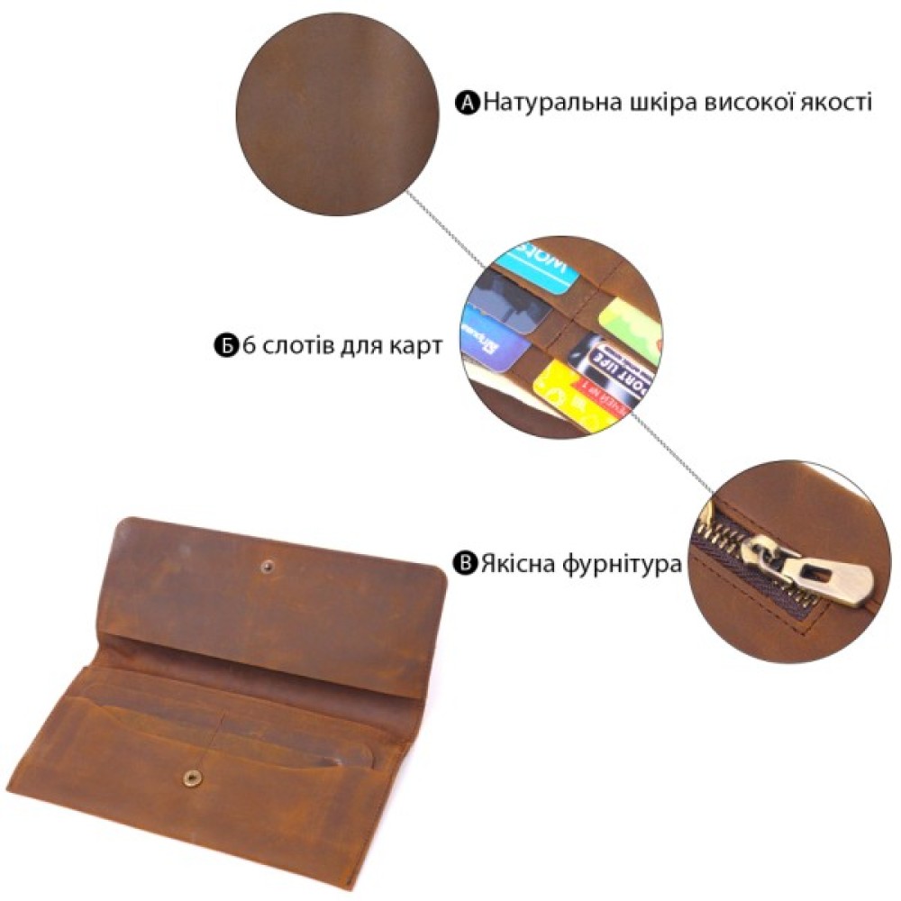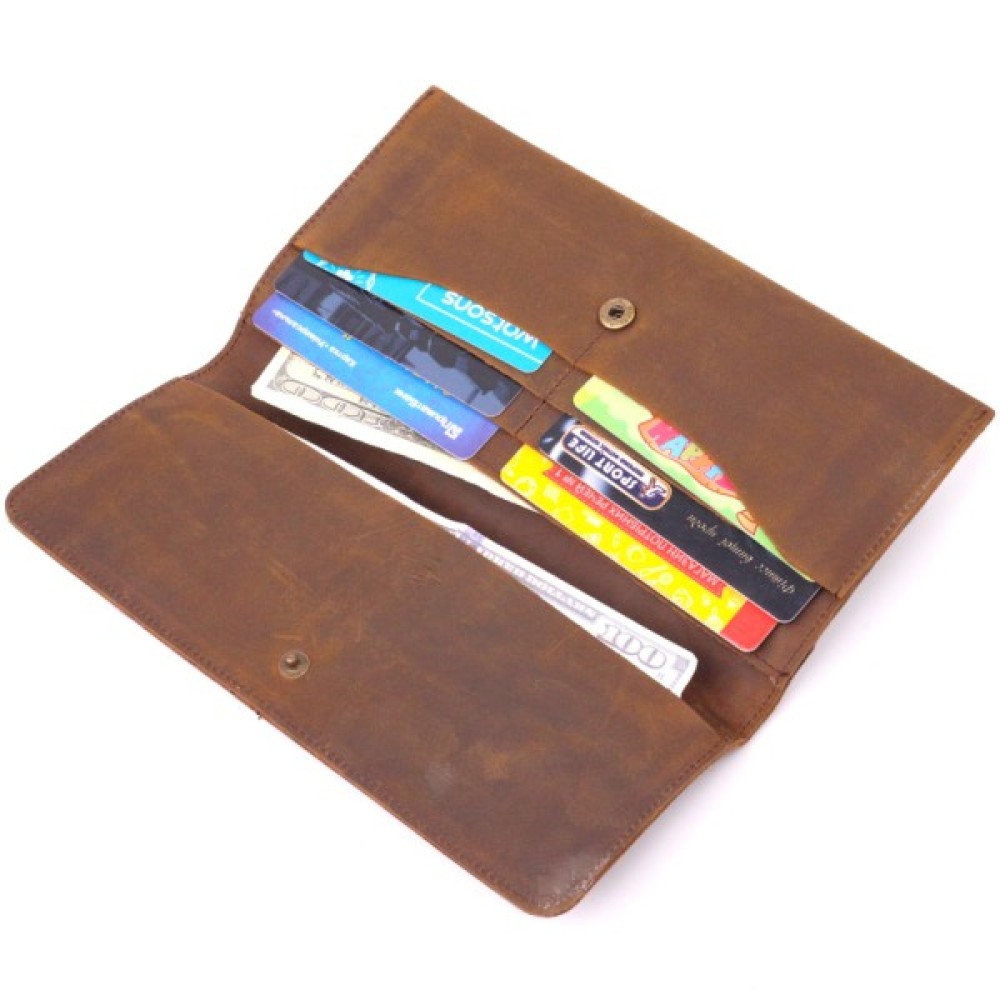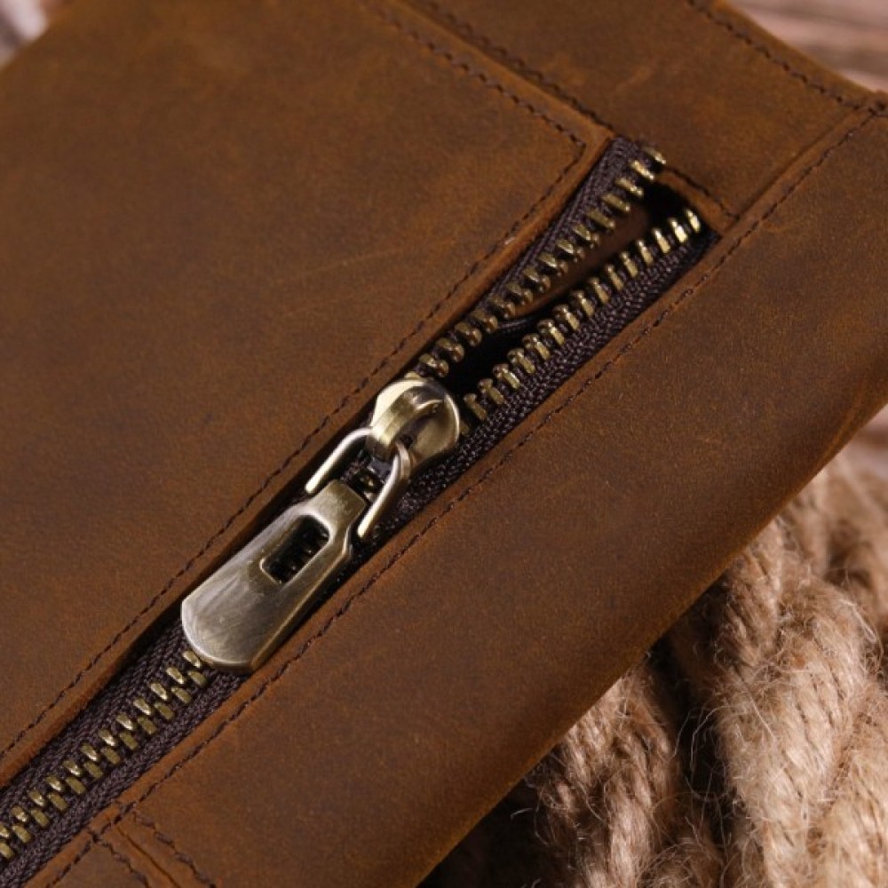 Стильний чоловічий гаманець із якісної натуральної вінтажної шкіри, що закривається клапаном на кнопку. Модель має одну секцію для зберігання купюр, які не складаються при використанні аксесуара, 6 слотів для кредитних карток, монетницю на блискавці, а також одну прилеглу кишеню.
