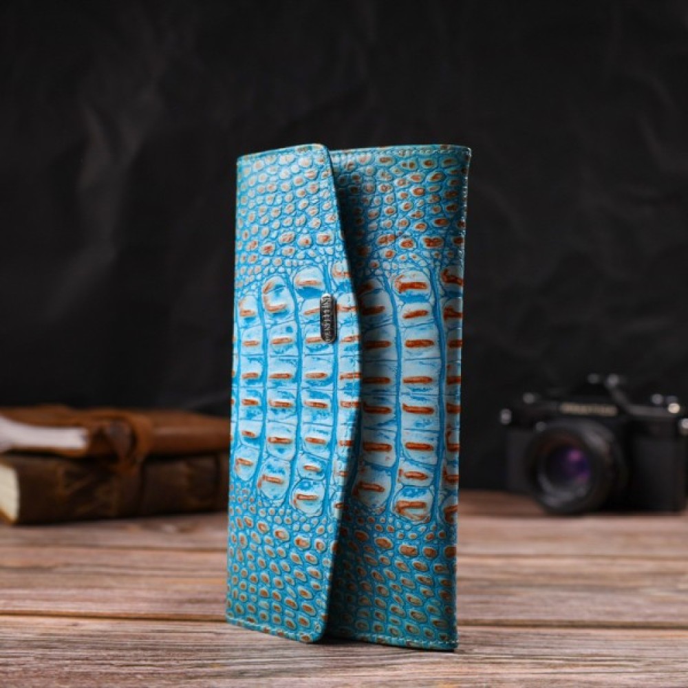Незвичайного кольору гаманець горизонтального типу з якісної натуральної шкіри з тисненням під крокодила. Аксесуар має одне основне відділення, вісім кишень для карток, чотири прилеглі кишені та монетницю. Закривається аксесуар навпіл клапаном на кнопку. Купуючи шкіряний аксесуар цієї фірми, собі або на подарунок, будьте певні, що він прослужить Вам не один рік.