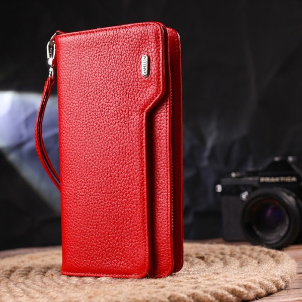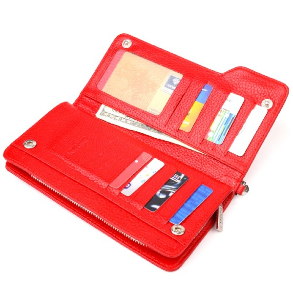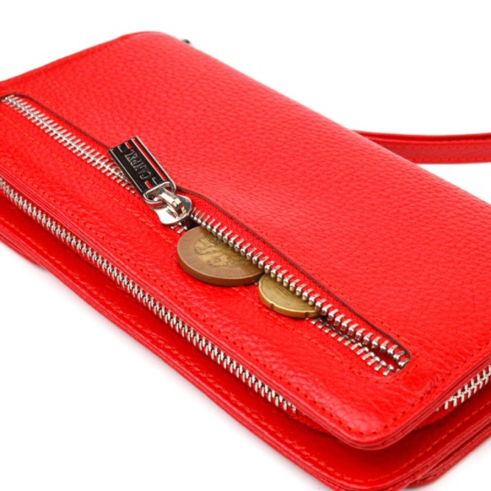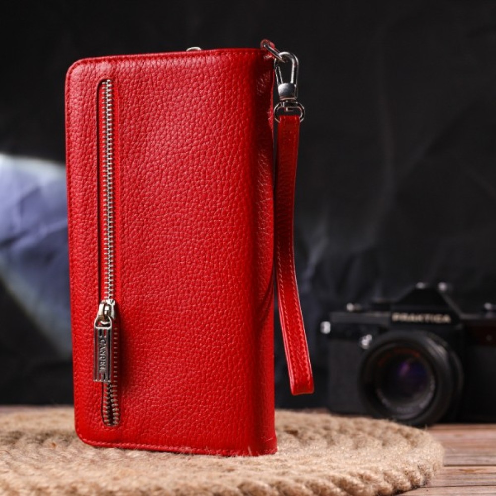 Місткий жіночий гаманець-клатч, з натуральної зернистої шкіри, в яскравому червоному кольорі. Аксесуар має одне основне відділення, в яке поміщаються купюри всіх номіналів, дванадцять кишень для карток, одна з яких під сіточкою, блок для карт із зовнішнього боку, дві кишеньки на блискавці, знімний кистьовий ремінь. Закривається аксесуар на блискавку, а блок для карток закривається на кнопки. Колір фурнітури – срібло. Шкіряний гаманець є дивовижним подарунком для дружини, дівчини, подруги.