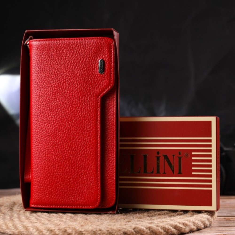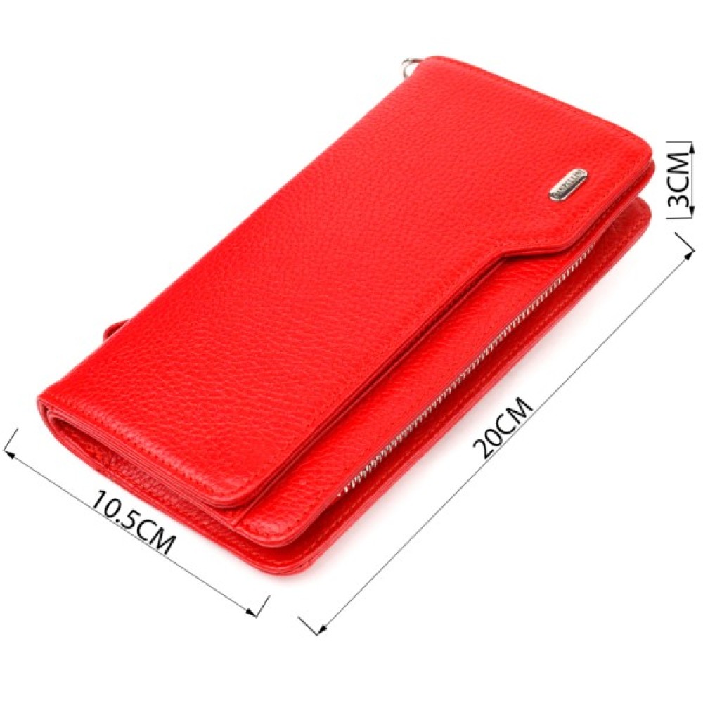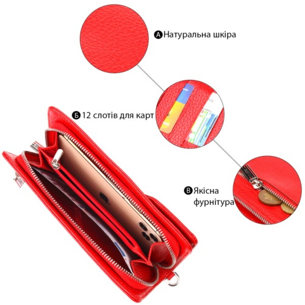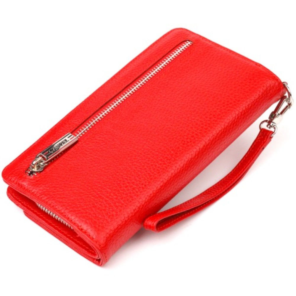 Місткий жіночий гаманець-клатч, з натуральної зернистої шкіри, в яскравому червоному кольорі. Аксесуар має одне основне відділення, в яке поміщаються купюри всіх номіналів, дванадцять кишень для карток, одна з яких під сіточкою, блок для карт із зовнішнього боку, дві кишеньки на блискавці, знімний кистьовий ремінь. Закривається аксесуар на блискавку, а блок для карток закривається на кнопки. Колір фурнітури – срібло. Шкіряний гаманець є дивовижним подарунком для дружини, дівчини, подруги.