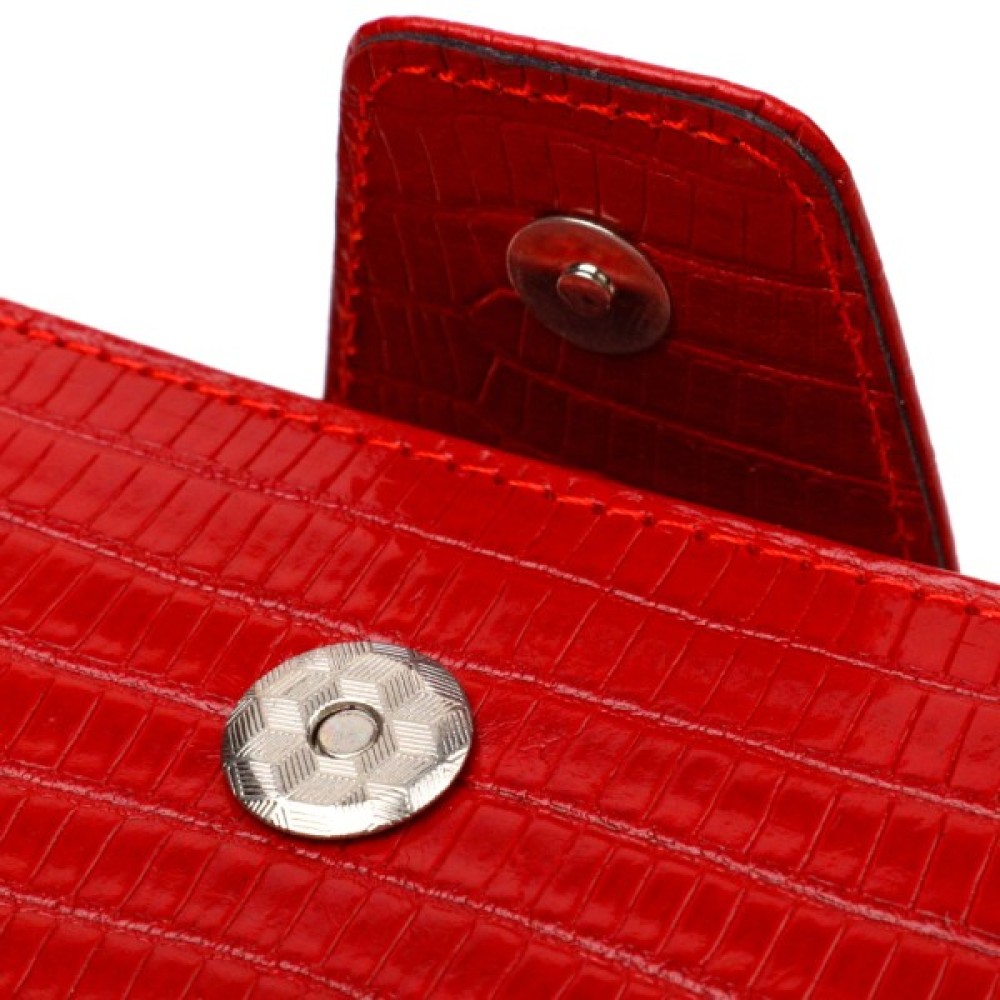 Чудовий жіночий гаманець вертикального типу із натуральної шкіри з тисненням. Аксесуар має відділення для купюр, вісім осередків для карток (два під сіточкою), дві прилеглі кишені та дві кишені на блискавках. Закривається аксесуар навпіл хлястиком на магніт. Купуючи шкіряний аксесуар цієї фірми собі або на подарунок, будьте певні, що він радуватиме око не один рік.