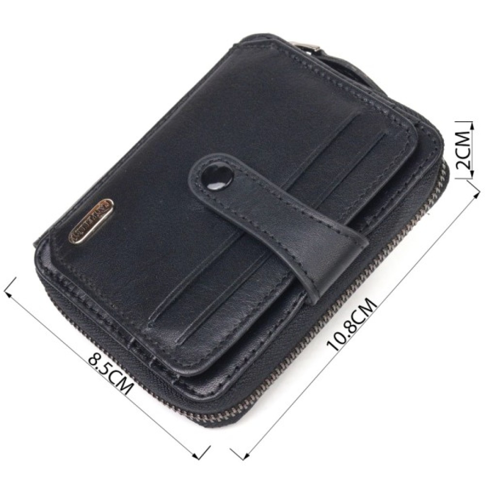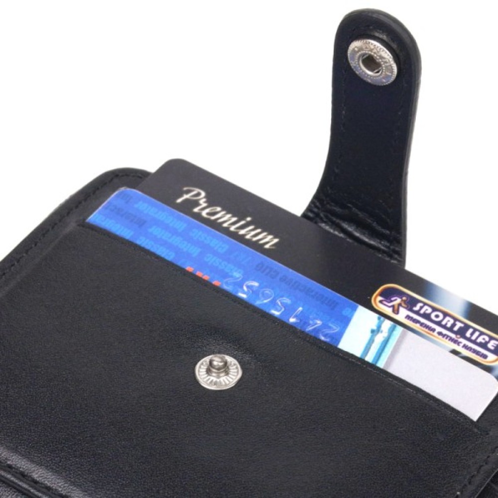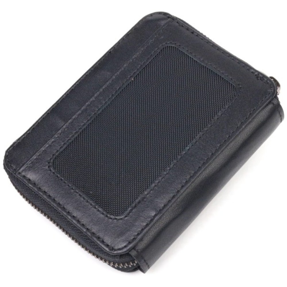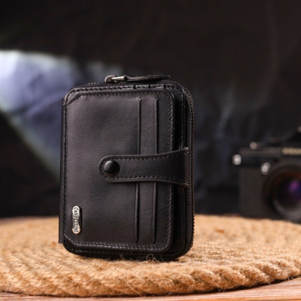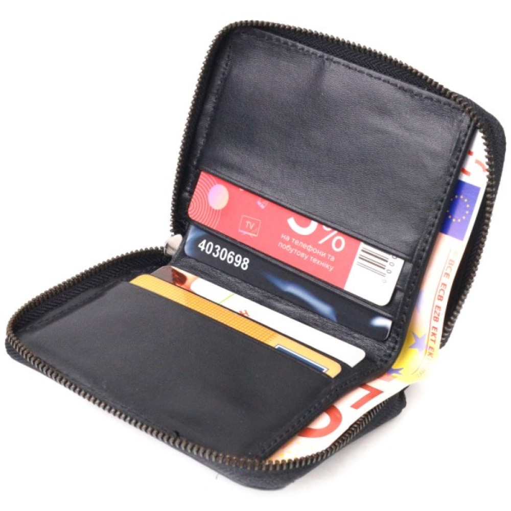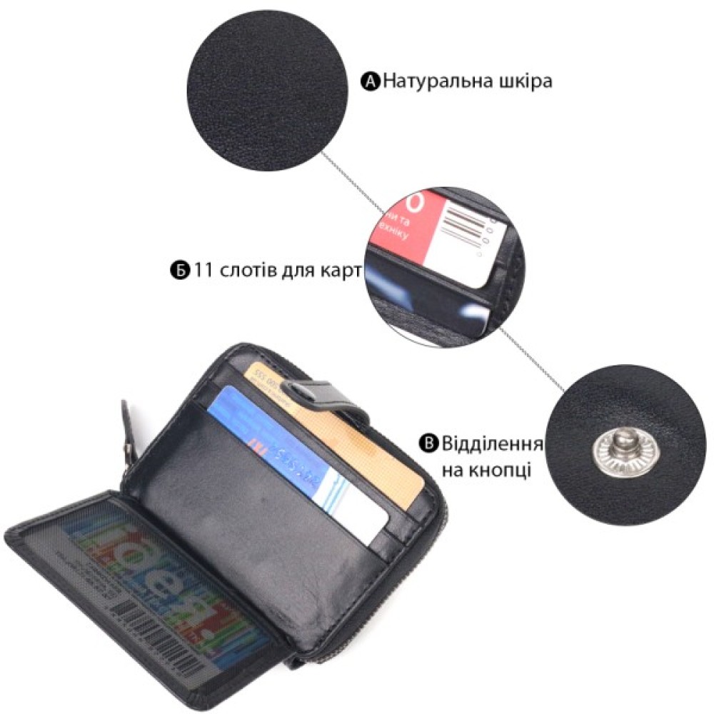 Унікальний гаманець унісекс із натуральної гладкої шкіри у класичному чорному кольорі. Аксесуар має одне основне відділення, в яке поміщаються купюри всіх номіналів, одинадцять кишень для карток (одна під сіточкою), блок для карток із зовнішнього боку, а також кишеню для пропуску під сіточкою з лицьового боку. Закривається на блискавку, а блок для карток — хлястиком на кнопку. Колір фурнітури – темне срібло. Шкіряний гаманець є чудовим подарунком на будь-який випадок життя.