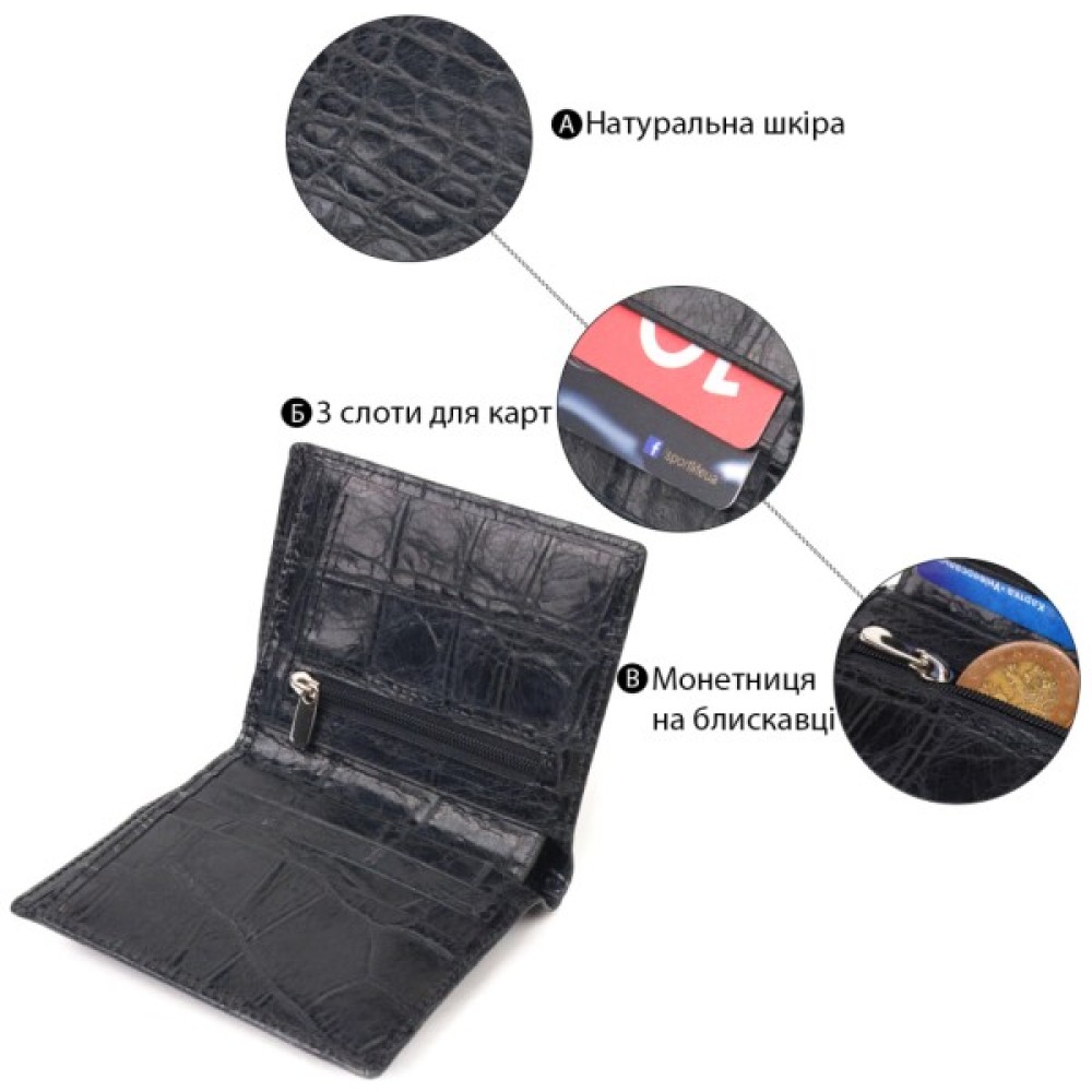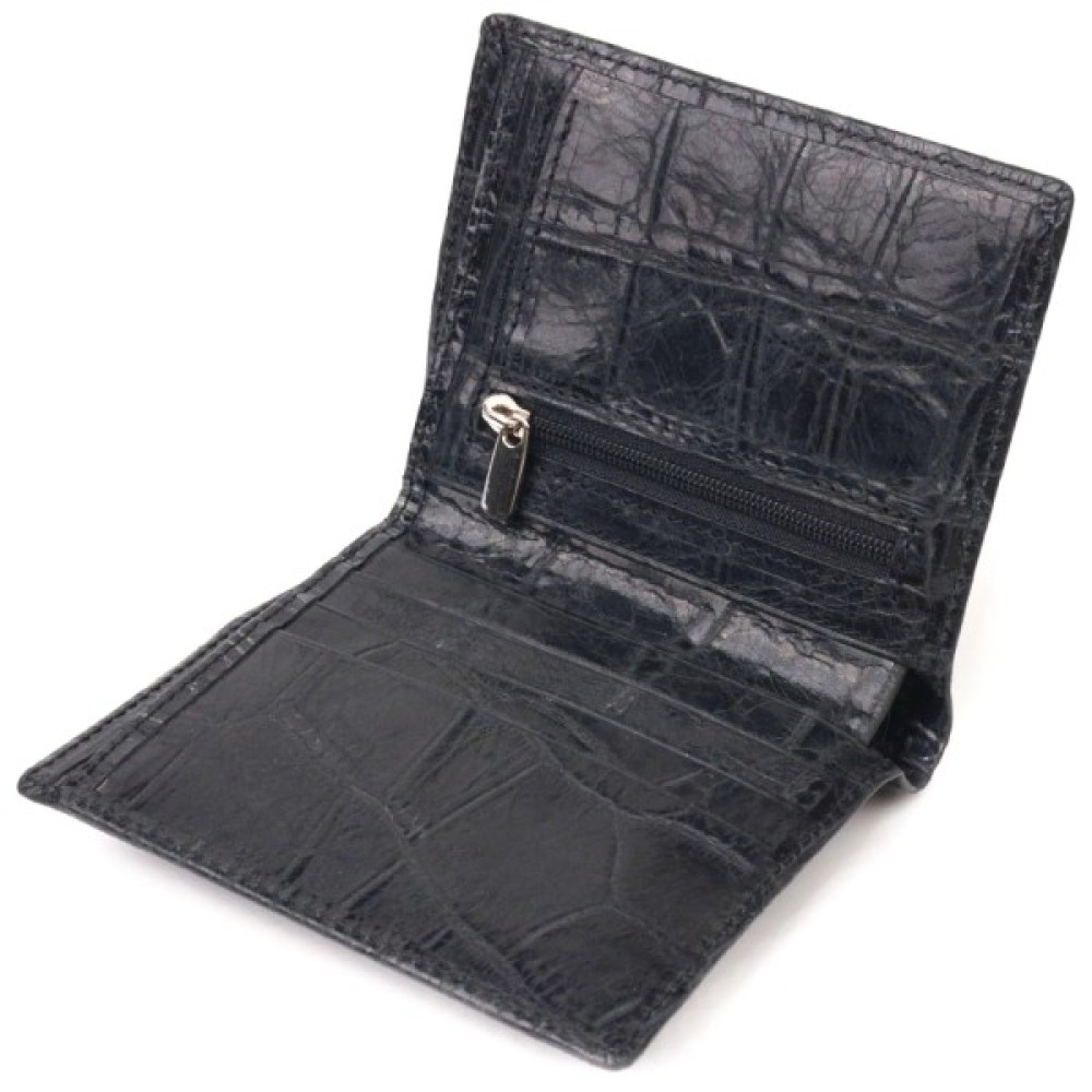 Гідне Вашої уваги чоловіче портмоне, з натуральної фактурної шкіри з тисненням під крокодила. Аксесуар має одне основне відділення з перегородкою, в яке поміщаються купюри всіх номіналів, три відсіки для карток, монетницю на блискавці з розширювачем, дві прилеглі кишені.