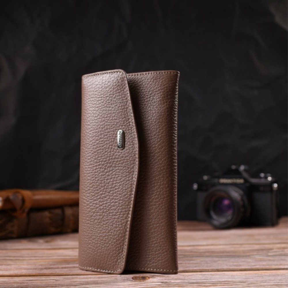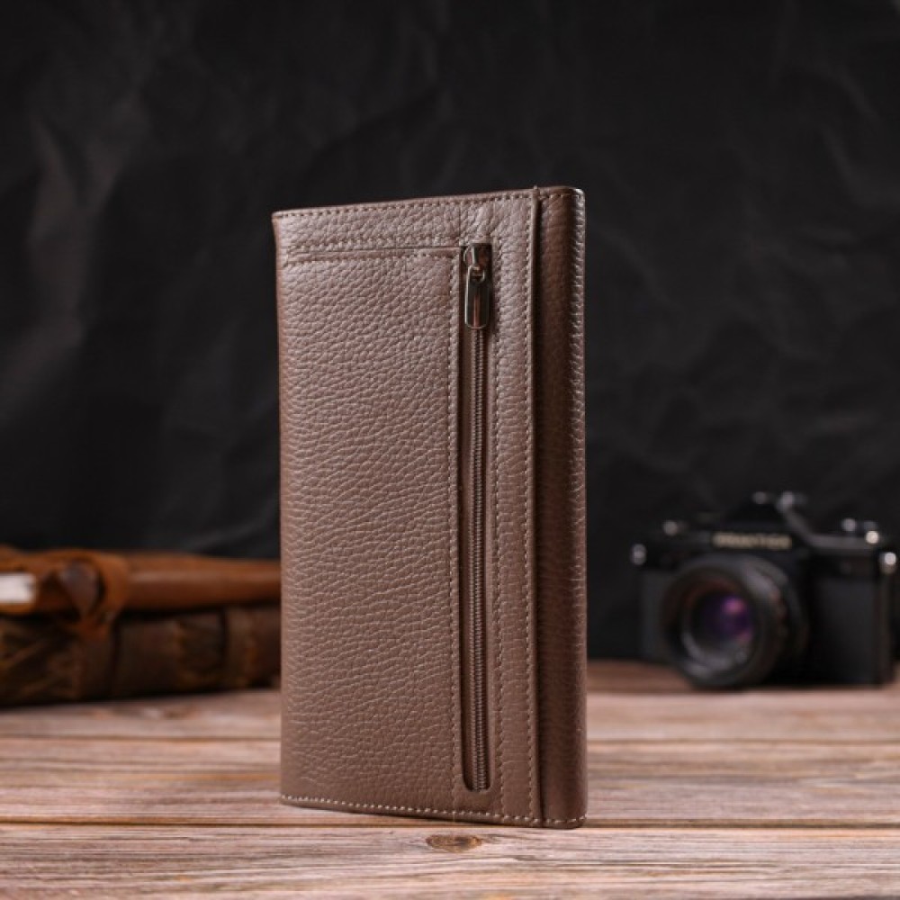 Лаконічний жіночий гаманець горизонтального типу із якісної натуральної шкіри. Аксесуар має одне основне відділення, вісім кишень для карток, чотири прилеглі кишені та монетницю. Закривається аксесуар навпіл клапаном на кнопку. Купуючи шкіряний аксесуар цієї фірми собі або на подарунок, будьте певні, що він прослужить Вам не один рік.