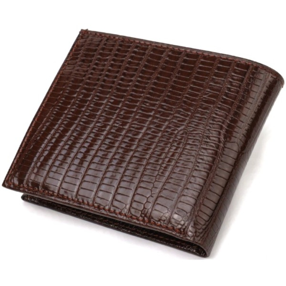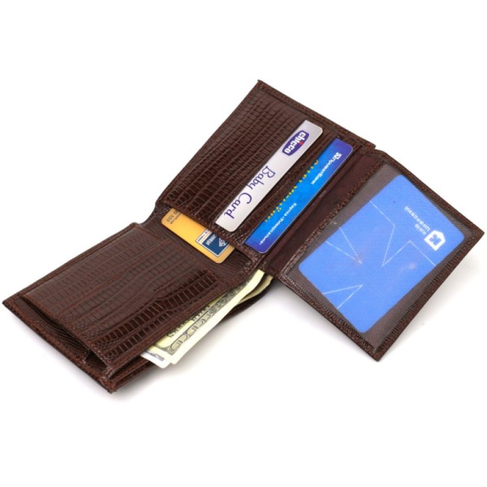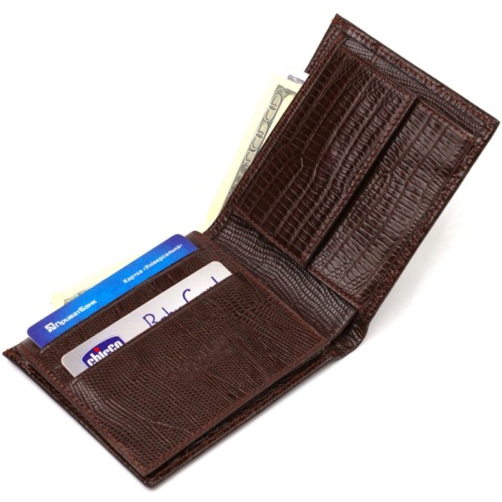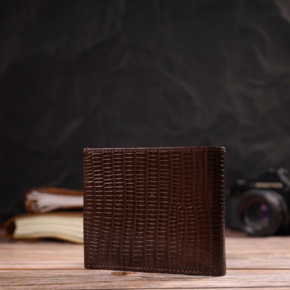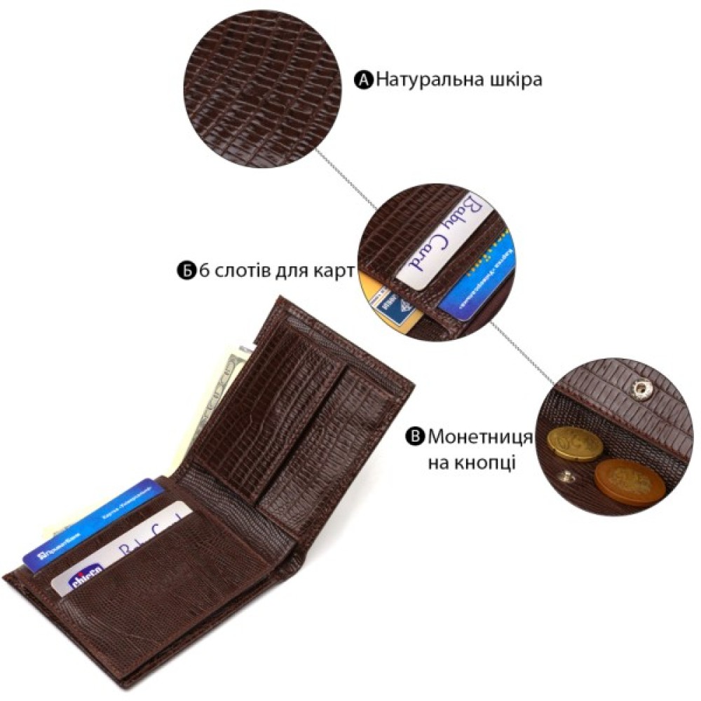 Цікавий чоловічий гаманець із натуральної фактурної шкіри, з тисненням. Аксесуар має одне основне відділення з тканинною перегородкою, в яке поміщаються купюри всіх номіналів, шість кишень для карток, кишеня під сіточкою для пропуску, одна прихована кишеня і монетниця.