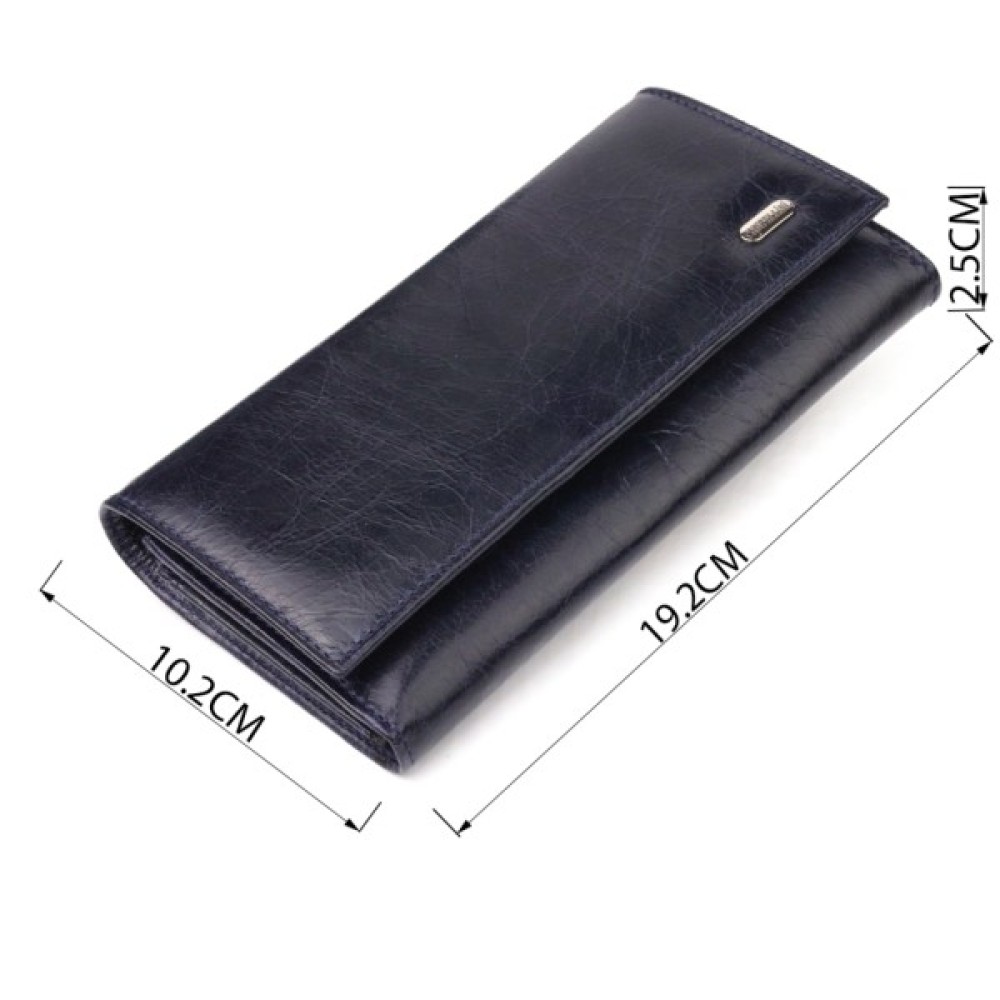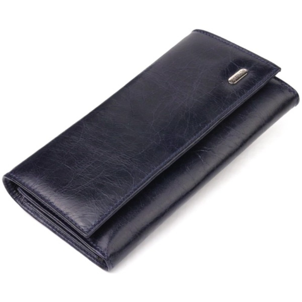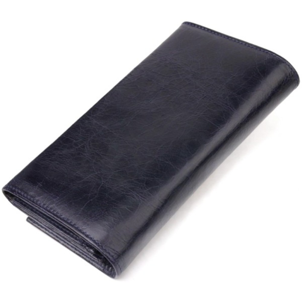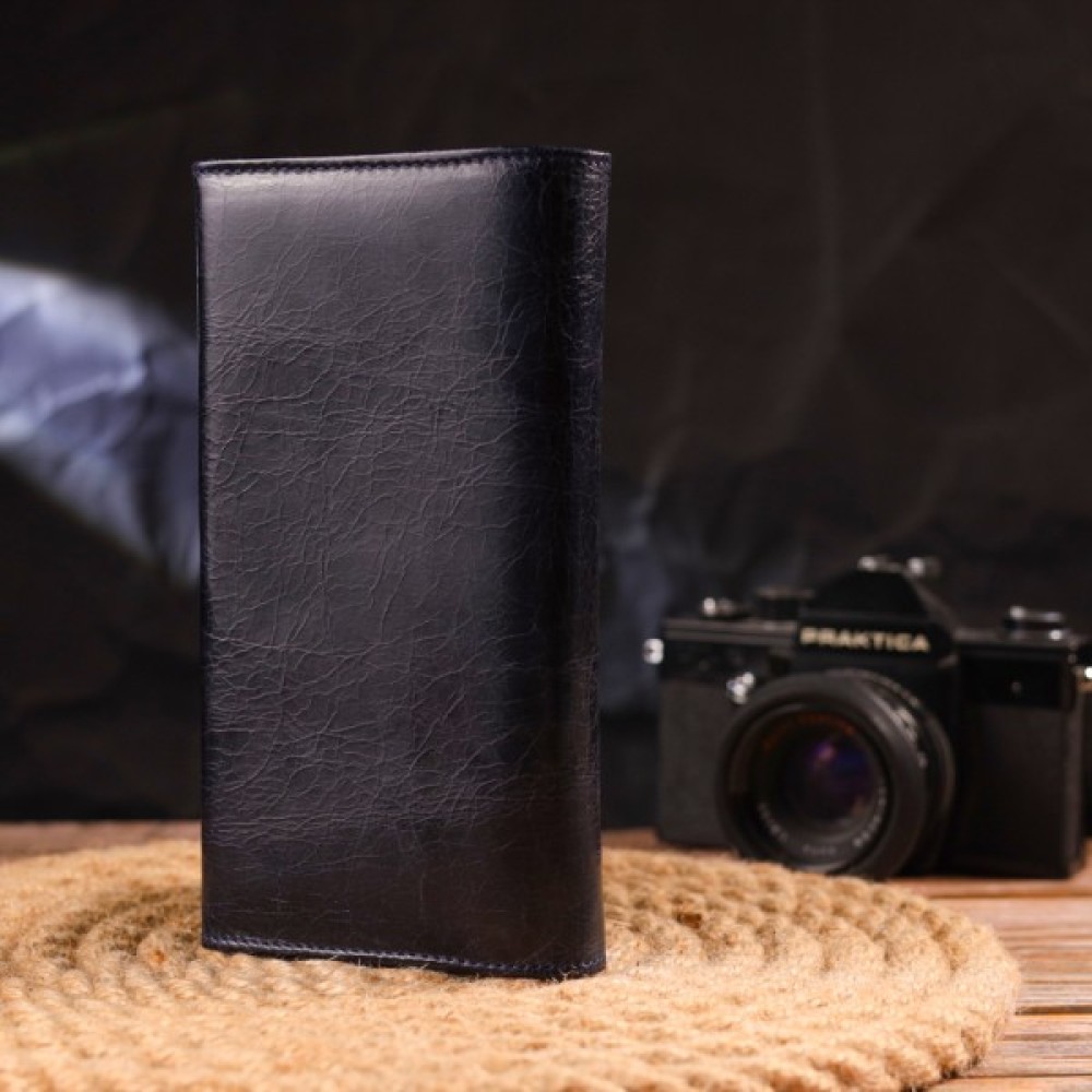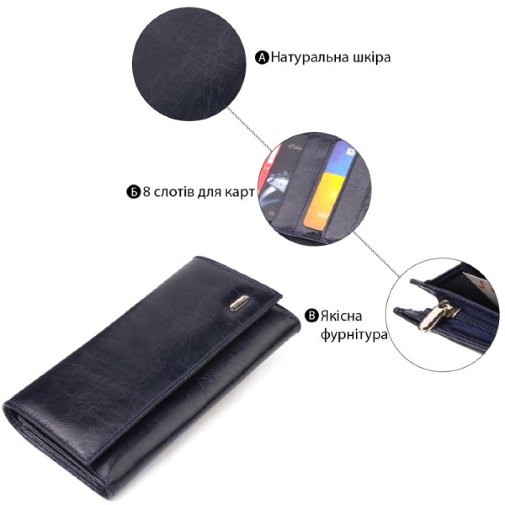 Чудовий горизонтальний жіночий гаманець із натуральної гладкої шкіри у стильному синьому кольорі. Аксесуар має три великі відділення для купюр, три прилеглі кишені, вісім осередків для карток, з яких три під сіточкою, та монетницю на блискавці. Виріб закривається клапаном на кнопку. Відмінна ідея для подарунка, яка не залишить байдужою жодну жінку.