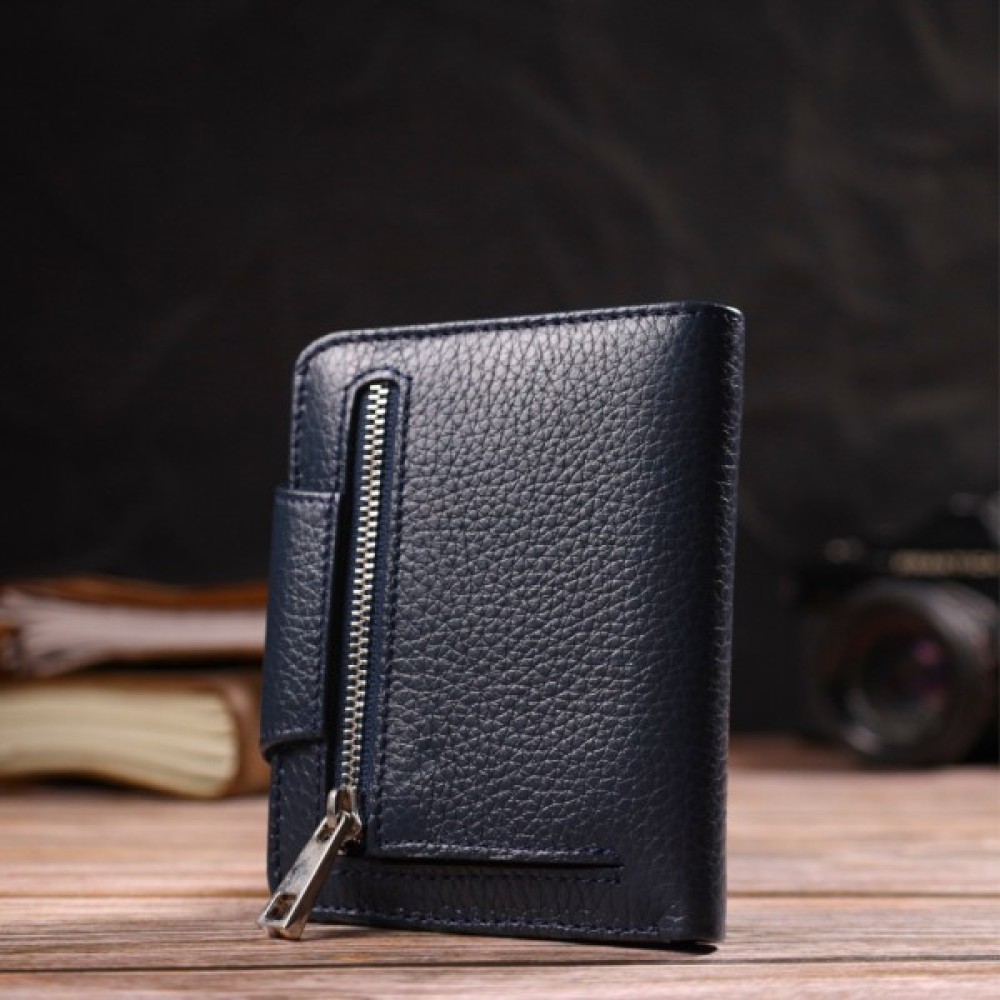 Стильний жіночий гаманець із натуральної шкіри флотар, яка відома своєю міцністю та зносостійкістю. Аксесуар має одне основне відділення з тканинною перегородкою, у яке легко поміщаються купюри всіх номіналів, чотири кишені для карток (одна під сіточкою), три приховані кишені та зовнішню монетницю. Закривається гаманець навпіл хлястиком на кнопку. Шкіряний аксесуар цієї фірми — це чудовий вибір як для себе, так і на подарунок, що слугуватиме довгі роки.