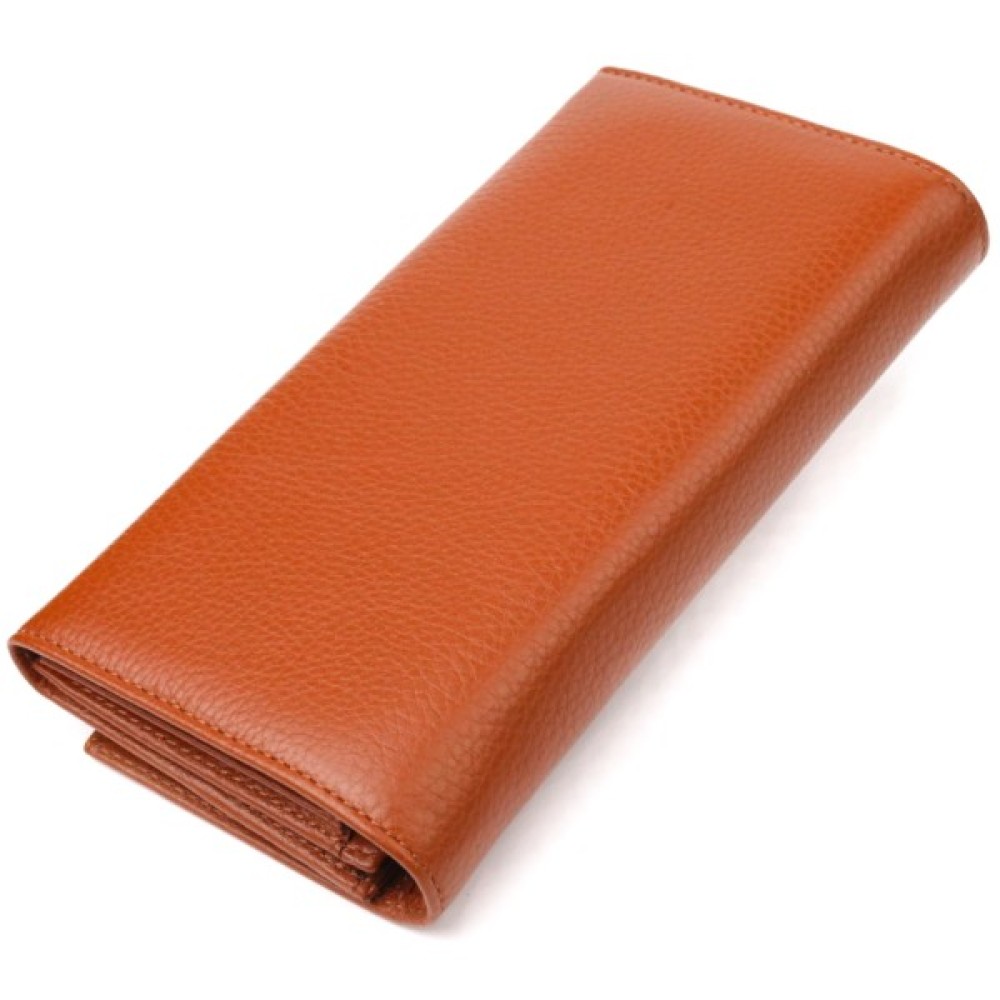 Зручний горизонтальний жіночий гаманець із натуральної зернистої шкіри, в стильному світло-коричневому кольорі. Аксесуар має три великі кишені для купюр, три прилеглі кишені, вісім осередків для карток, три з них під сіточкою, монетницю на блискавці. Виріб закривається клапаном на кнопку. Відмінна ідея для подарунка, яка не залишить байдужою жодну жінку.