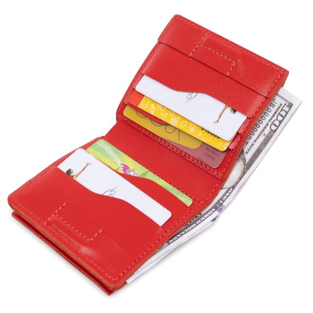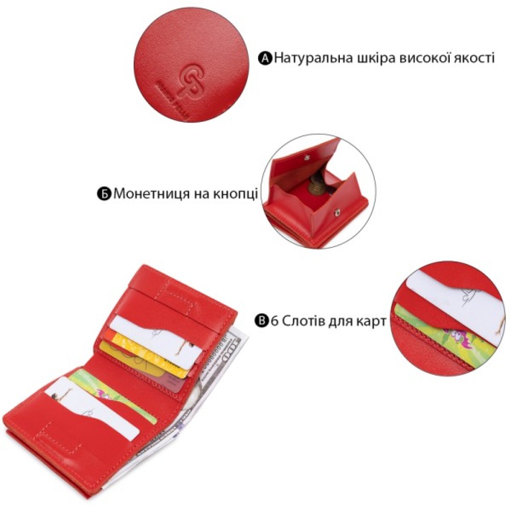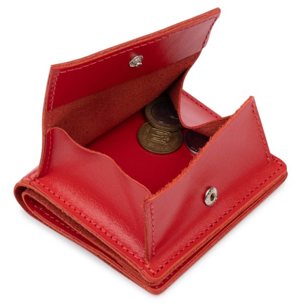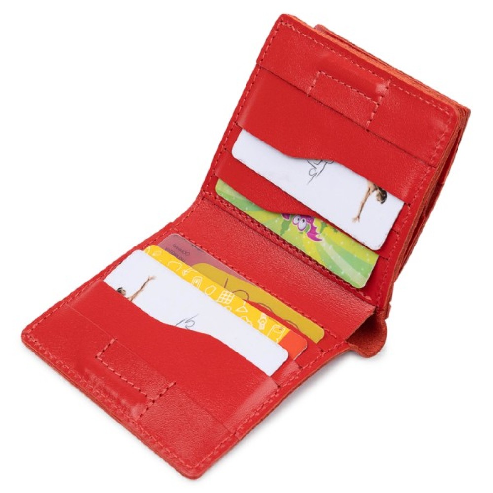 Невелике, але містке жіноче портмоне з оригінальною монетницею на кнопці. Матеріал виготовлення – стійка до зносу натуральна шкіра високого класу. Усередині є відділення для купюр та слоти для візитних та кредитних карток. Таке портмоне не займає багато місця, тому поміститься до сумочки будь-якого розміру.