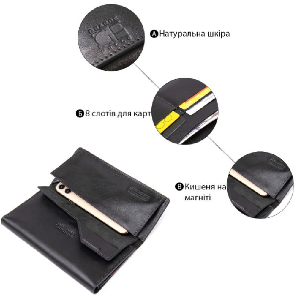 Багатофункціональний портмоне на хлястику з магнітом. Має всередині місткі і практичні відділення для купюр, велику монетницю на магніті і вісім слотів для різних карт і візиток.