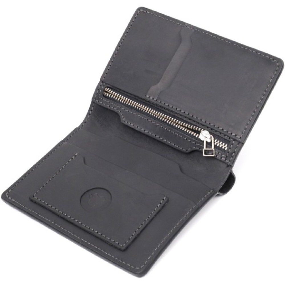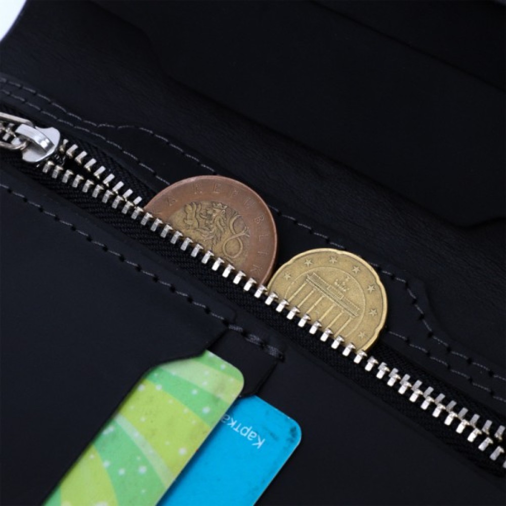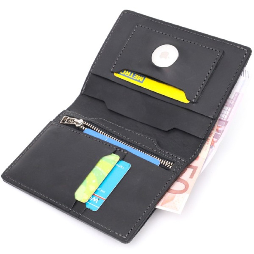 Гаманець складається з одного місткого відділення для купюр, трьох слотів під кредитки, монетниці на блискавці, чотирьох прилеглих кишень та тримача для смарт-трекера Apple AirTag.