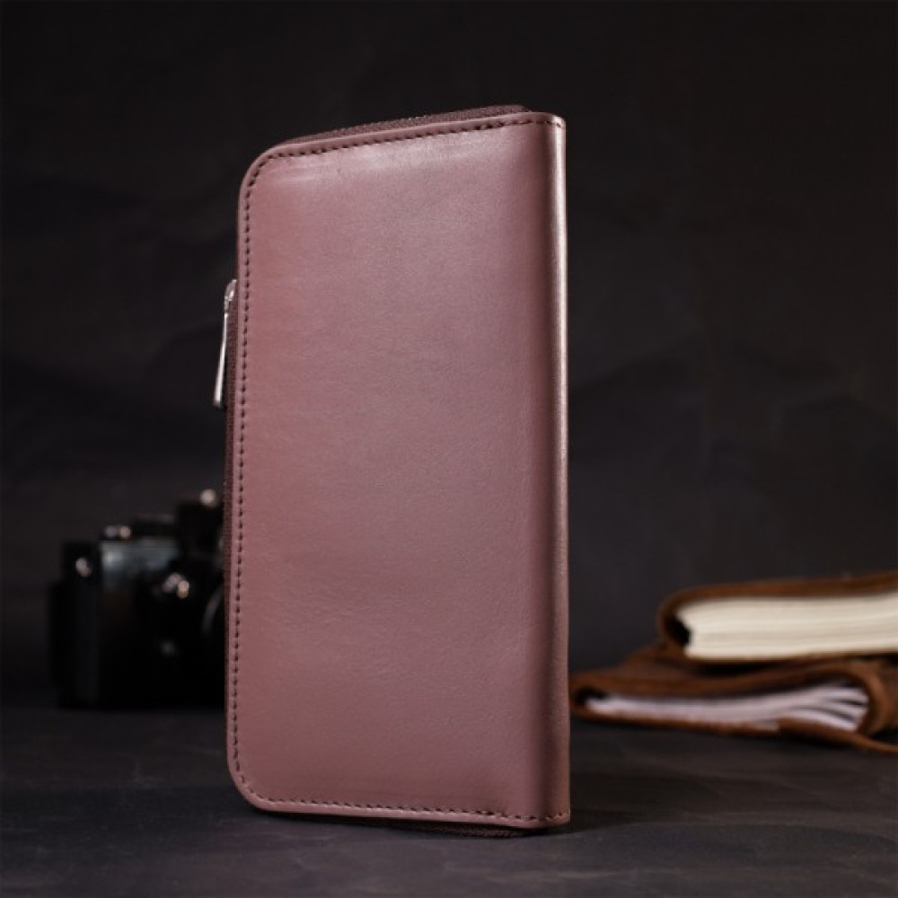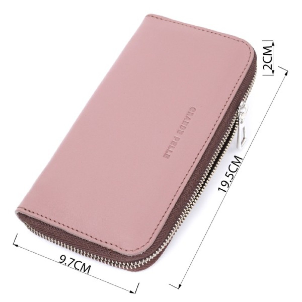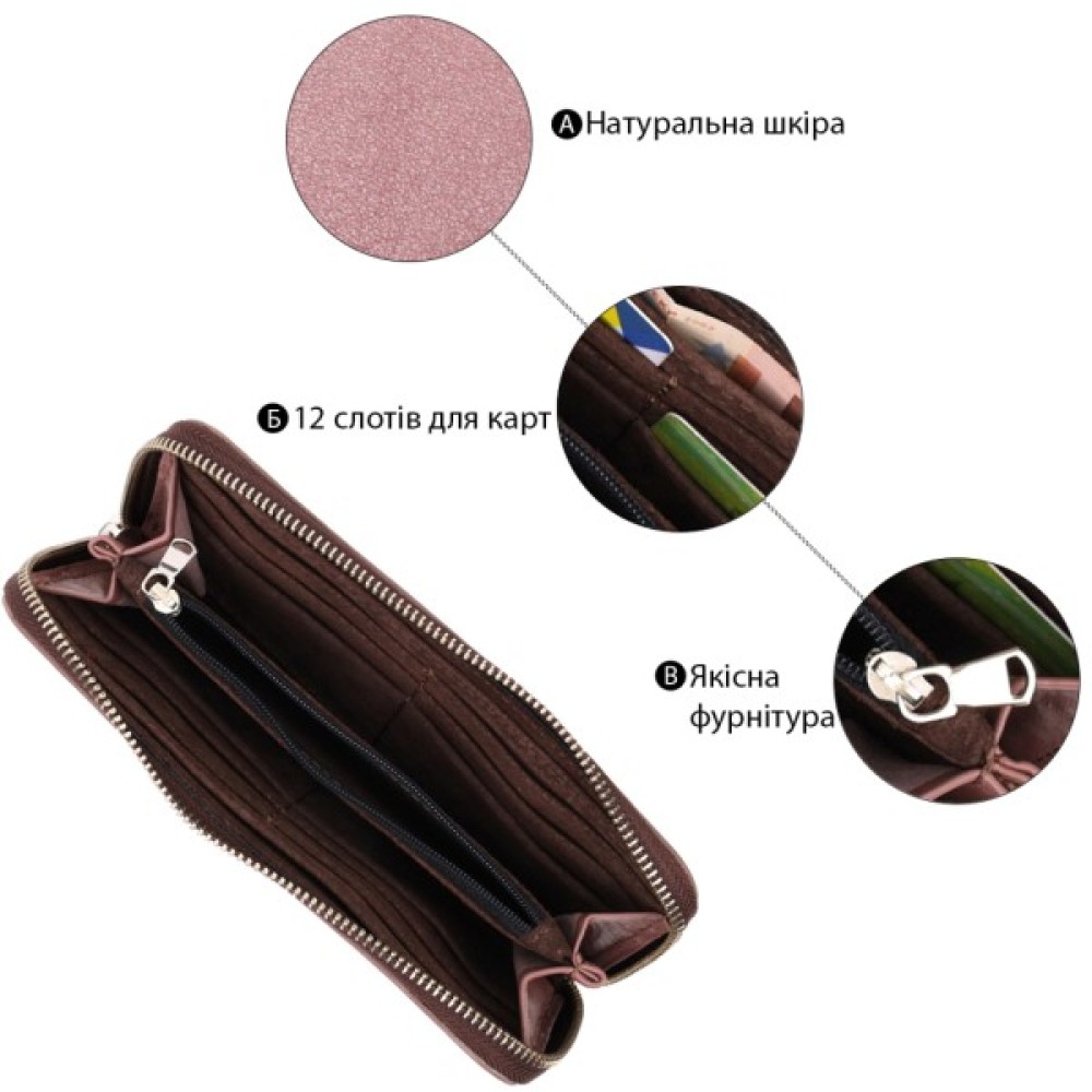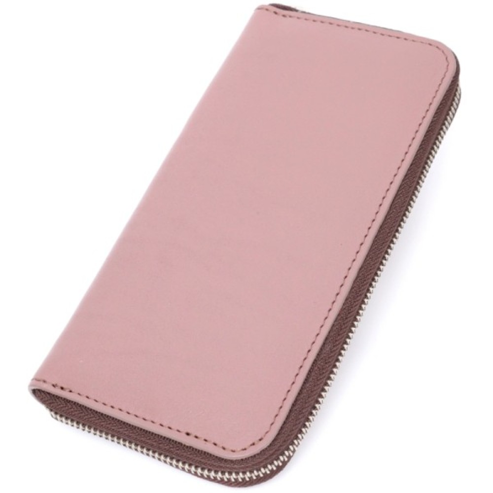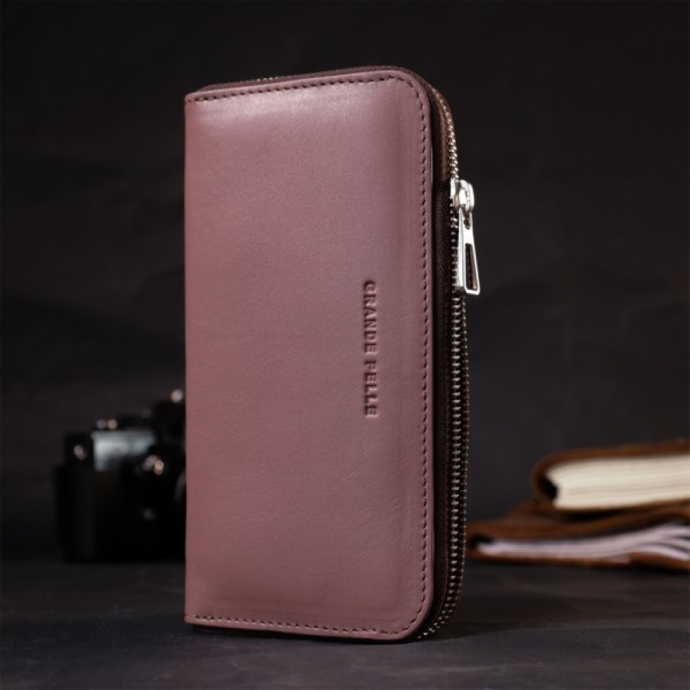 Зручний та місткий гаманець на блискавці із натуральної високоякісної шкіри. Має гарний пудровий колір та гладку фактуру. Внутрішнє наповнення добре продумане та практичне, в ньому розмістяться купюри, монети, різні картки і навіть смартфон. Запакований цей гаманець у фірмову картонну коробку з логотипом бренду. Ми впевнені, що вироби української фірми Grande Pelle, нікого не залишать байдужими, і Ви ще неодноразово повернетесь за цими якісними шкіряними аксесуарами.