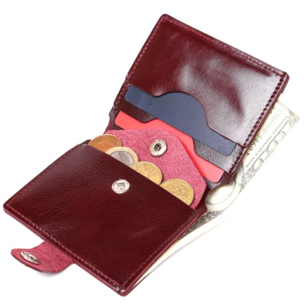 Жіноче стильне портмоне невеликого розміру від українського виробника. Має красивий темно-бордовий колір із легким відливом, що виглядає дуже красиво. Виконано виріб із натуральної високоякісної шкіри з чудовими характеристиками зносостійкості. Усередині є містке відділення для купюр, слоти для карток та монетниця на кнопці.