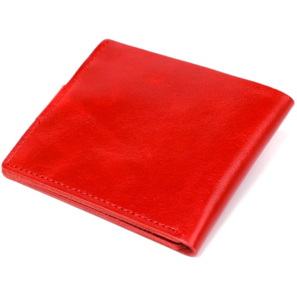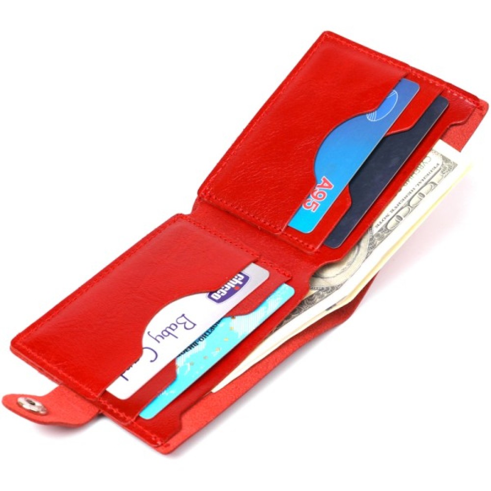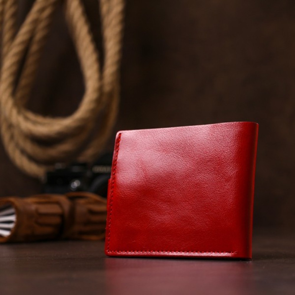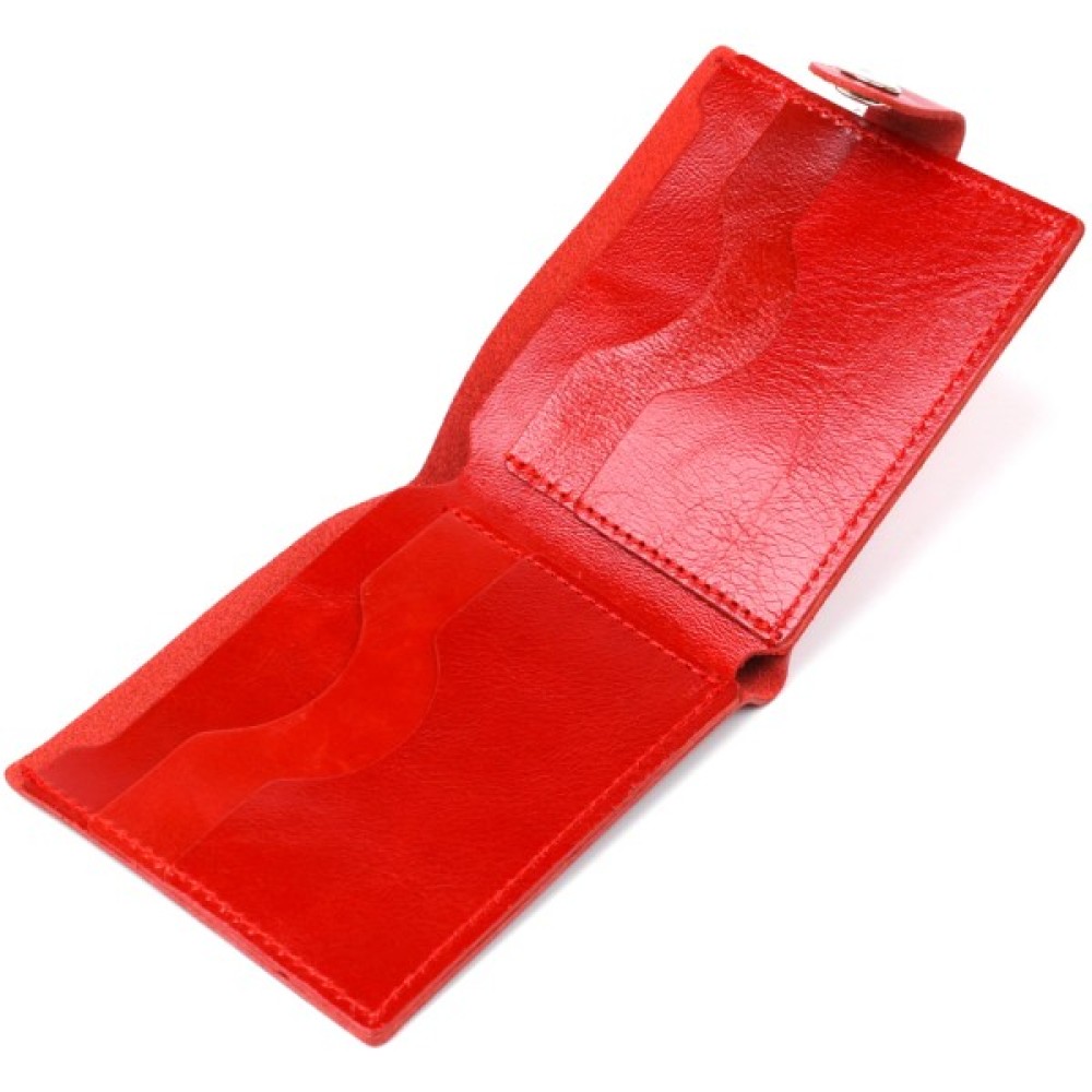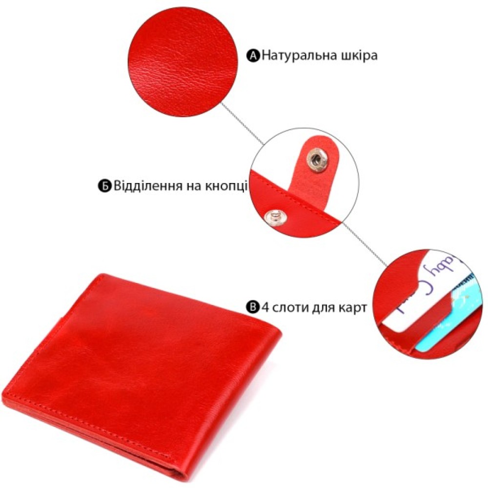 Компактное женское портмоне из натуральной высококлассной кожи от украинского производителя. Цвет изделия – насыщеный красный, фактура – гладкая. Внутри присутсвует просторное отдление на всю длину для купюр и банкнот, несколько слотов для пластикових кредитних и визитных карточек. Закрывается аксесуар на кожаный хлястик с кнопкой.