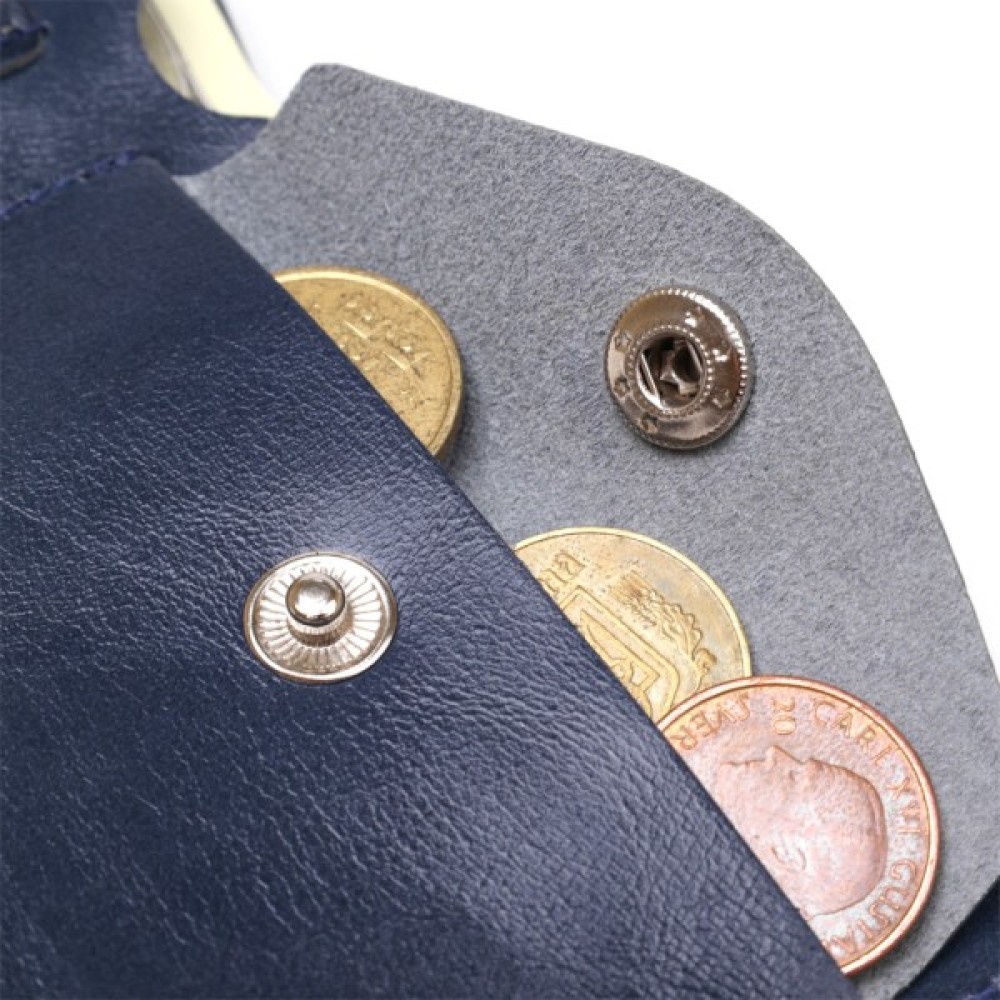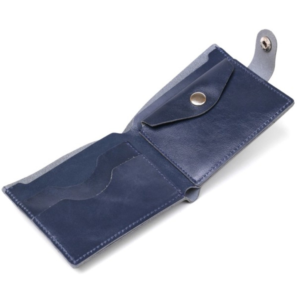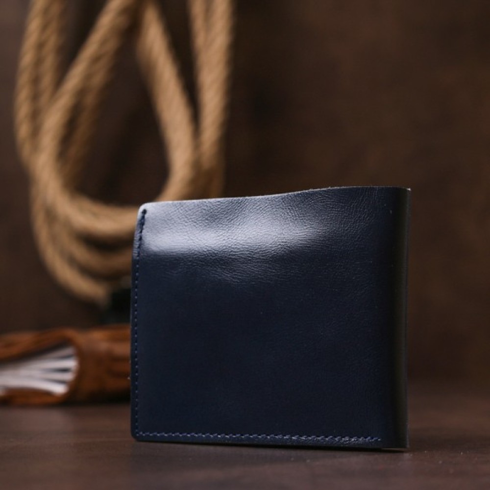 Компактне стильне портмоне в стильному акуратному дизайні. Виконаний аксесуар із натуральної шкіри високої якості та підвищеною стійкістю до зносу. Усередині є просторе основне відділення на всю довжину, кишені для пластикових карток та монетниця на кнопці. Колір виробу темно-синій, фактура гладка.