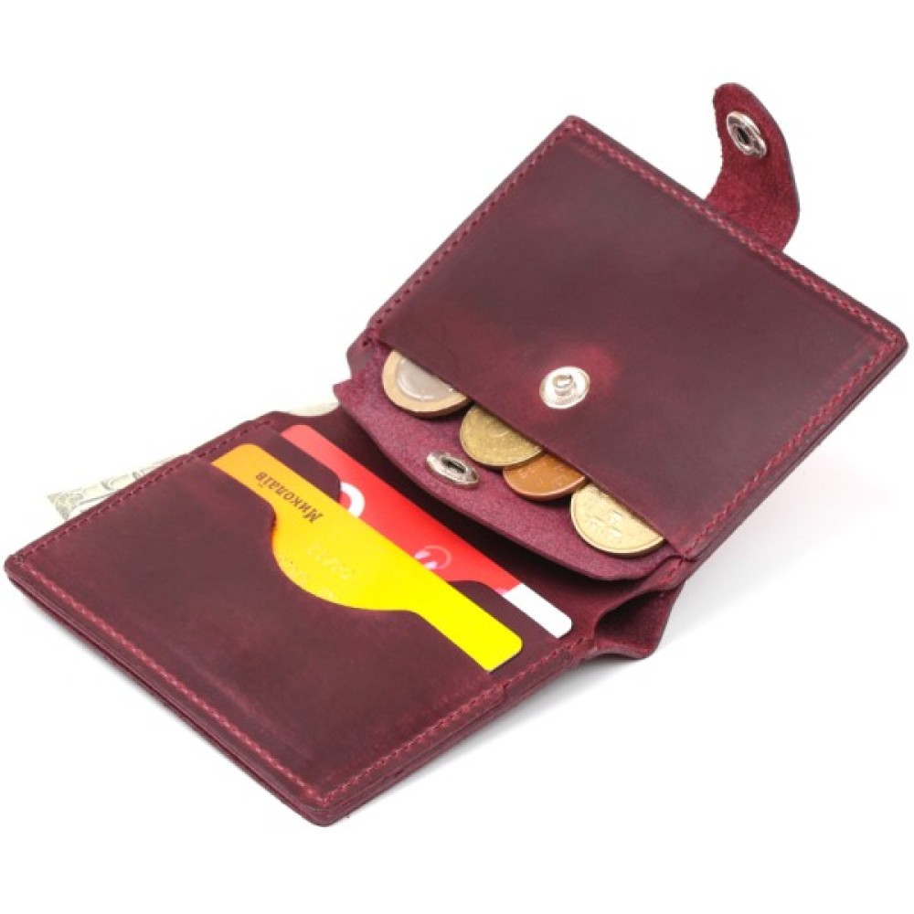 Чудове жіноче портмоне у темно-вишневому кольорі, що виглядає дуже стильно та красиво. Має гладку матову фактуру, яка дуже приємна на дотик. Матеріал виготовлення – натуральна зносостійка шкіра високого класу. Закривається аксесуар на хлястик із кнопкою. Таке портмоне чудово підійде на подарунок на будь-яке свято.