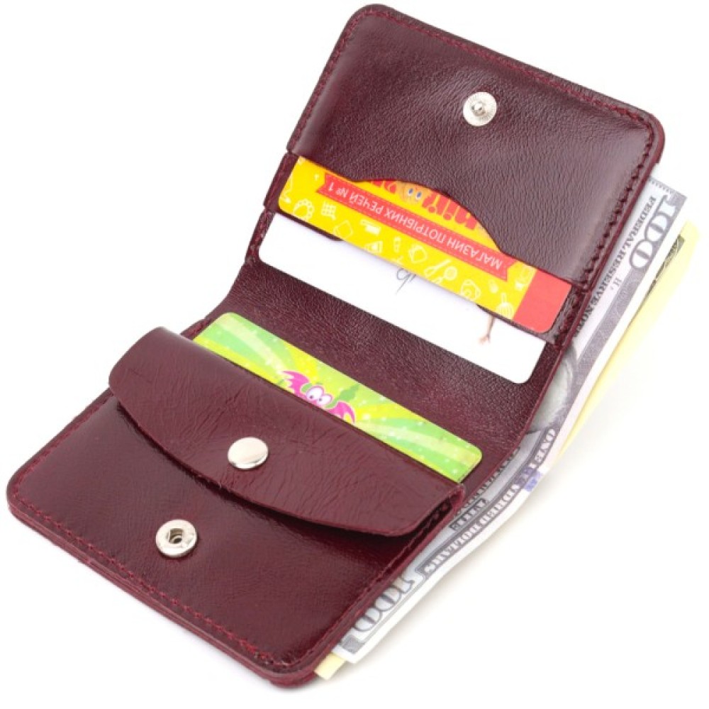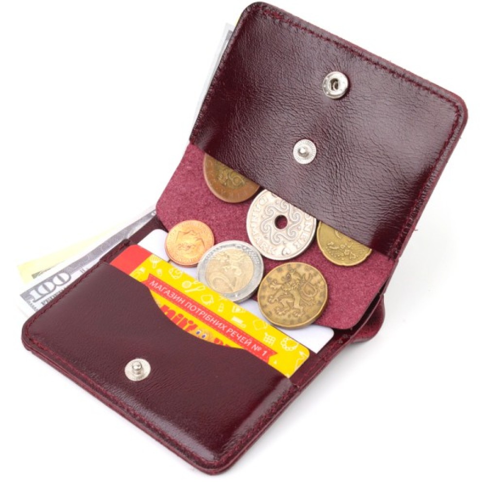 Яскраве жіноче портмоне в сучасному дизайні та красивому вишневому кольорі. Виконано виріб з натуральної глянсової шкіри високої якості та відмінної стійкості до зношування. Портмоне має містке відділення для купюр, слоти для пластикових карток та монетницю. Закривається аксесуар на кнопку. Якщо ви шукаєте подарунок для яскравої близької людини, то дана модель відмінно для цього підійде.