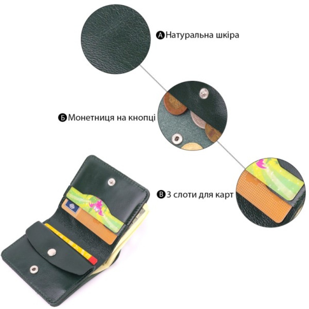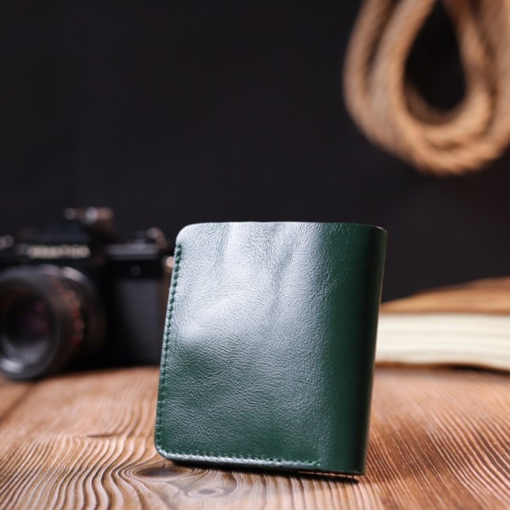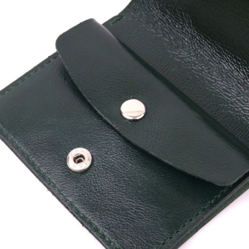 Містке невелике портмоне з натуральної глянсової шкіри в сучасному дизайні і незвичайному кольорі. Такий аксесуар оцінять любителі натуральних та якісних речей, виріб виконаний з шкіри високої якості. Портмоне має містке відділення для купюр, слоти для пластикових карток та монетницю. Закривається аксесуар на кнопку. Цей аксесуар чудово підійде як подарунок і принесе виняткову радість близькій людині.