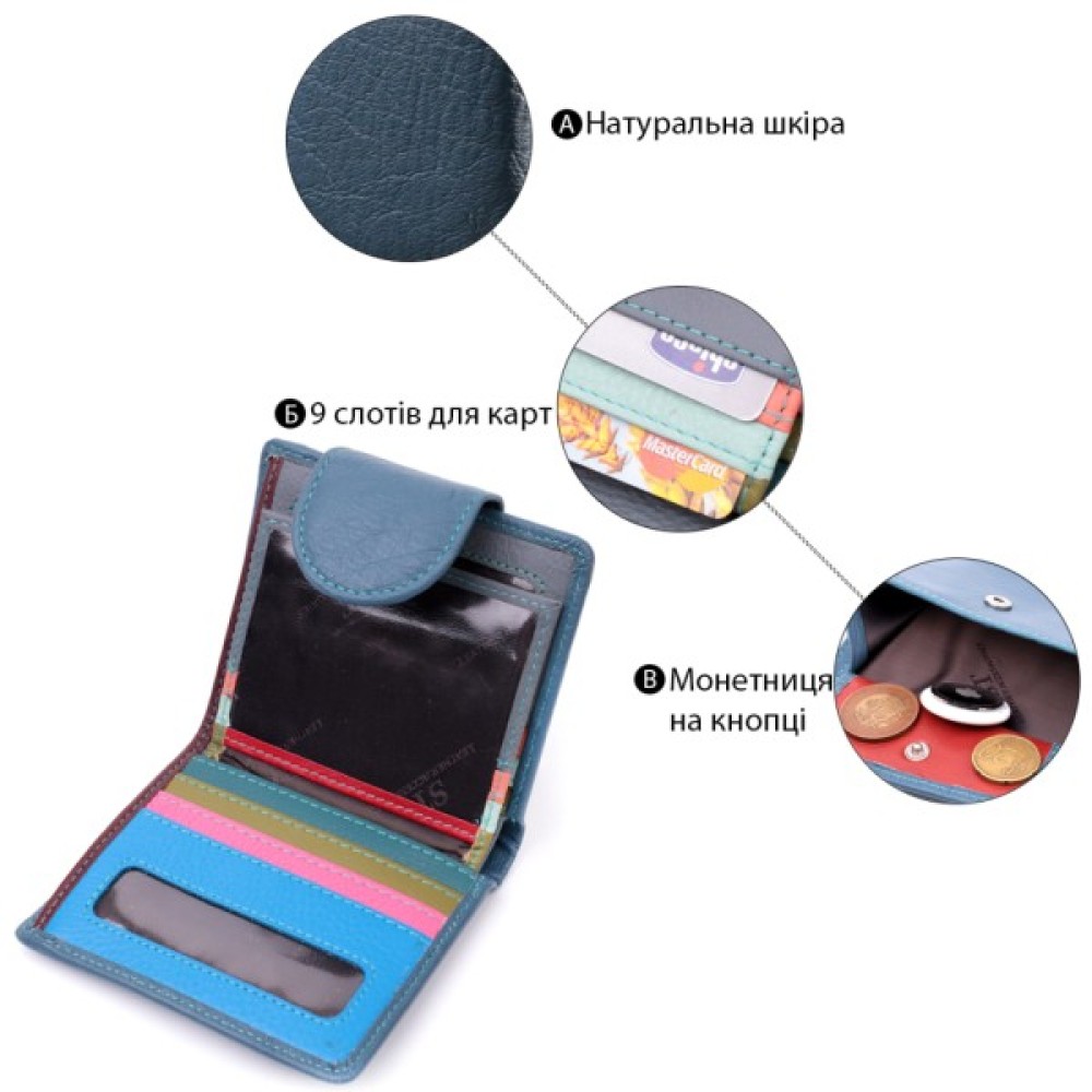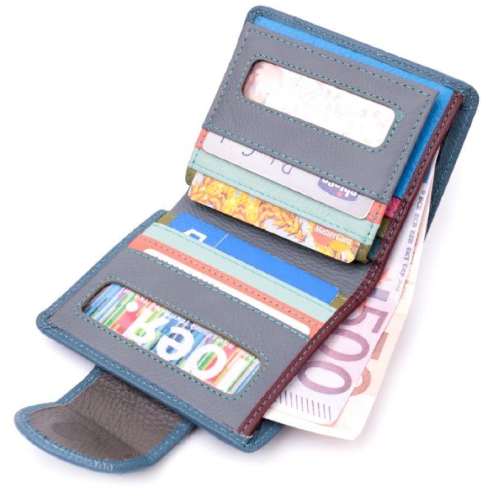Гаманець сіро-бірюзового кольору зовні та різнобарвний усередині, що дуже стильно та сучасно.