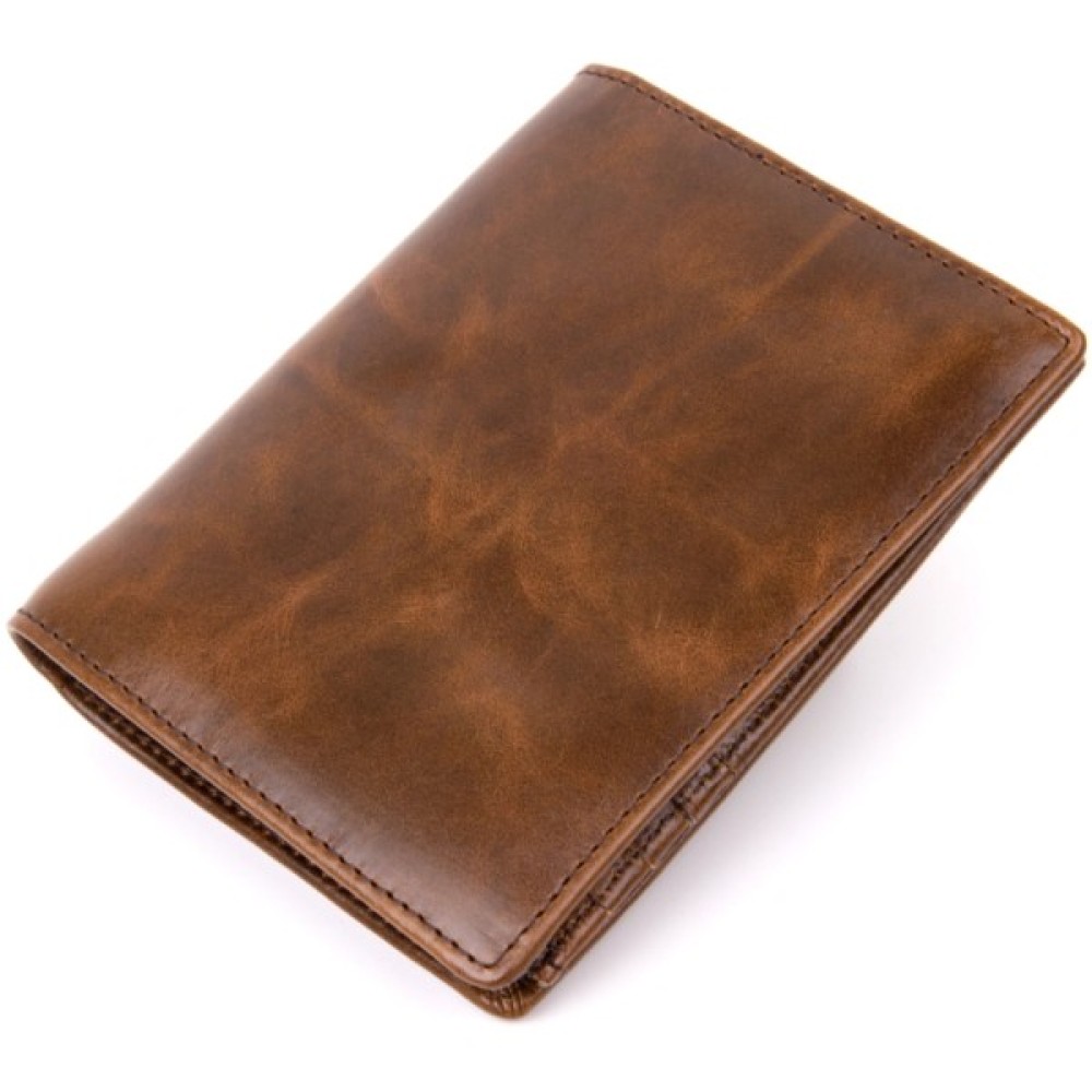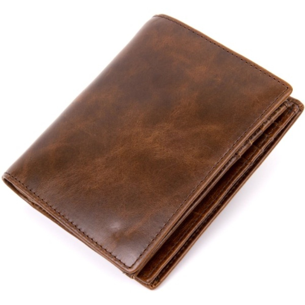 Тонке компактне портмоне з натуральної шкіри без застібки насиченого коричневого кольору. Виріб має дві кишені для купюр. Усередині досить осередків для кредиток. Виріб продумано для сучасної людини, яка віддає перевагу карткам і носить мінімум готівки. Оригінальний аксесуар вигідно виділить вас з натовпу. Гаманець стане прекрасним подарунком для ваших близьких.