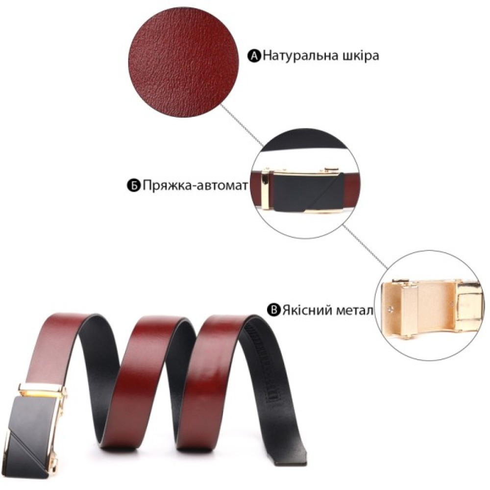 Ремінь можна носити коричневою або чорною стороною, для цього потрібно лише перевернути пряжку на бажану сторону. Хороший ремінь здатний ідеально завершити образ та підкреслити ваш статус. Ремінь виготовлений із цільного полотна шкіри, має гладку фактуру, довжина регулюється у менший бік. Доповнено ремінь надійною пряжкою-автомат. Шкіряний ремінь один із найвдаліших і потрібних подарунків для близької людини.