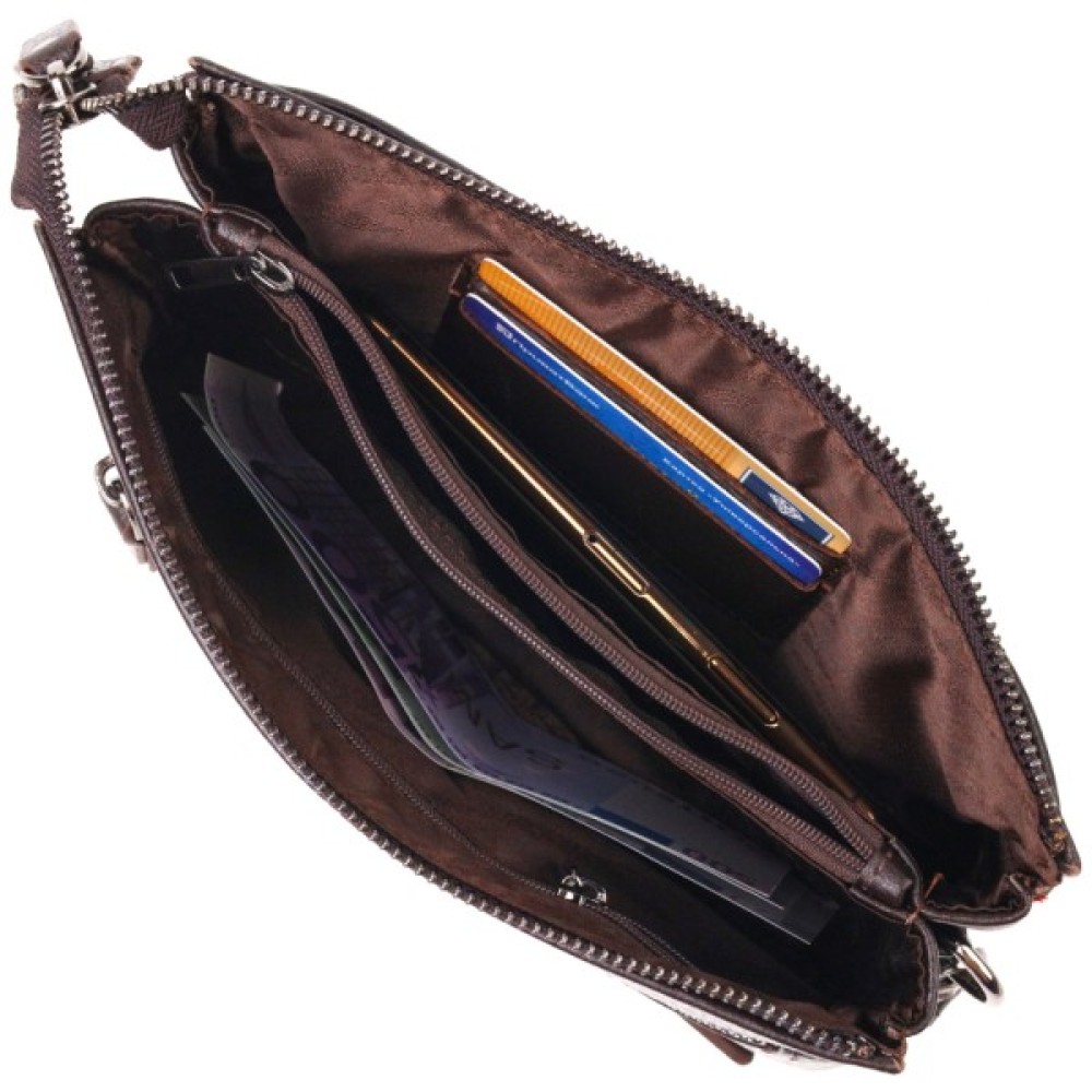Аксесуар має одне основне відділення, всередині якого дві кишені на блискавках та два осередки для кредитних карток.