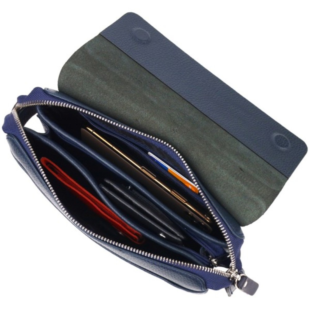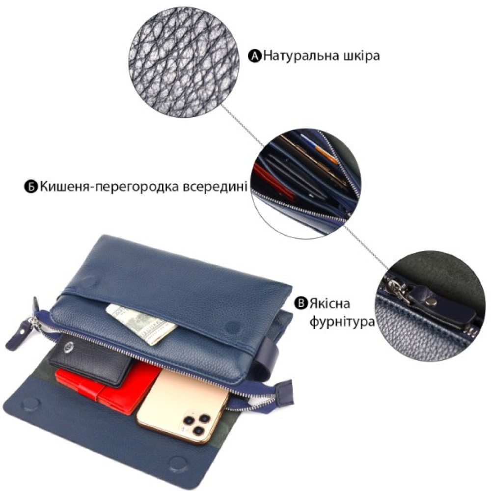 Дуже красивий місткий клатч для чоловіків з натуральної якісної шкіри. Аксесуар має продуману організацію простору: одне основне відділення, всередині дві бічні кишені (одна з них на блискавці) та кишеня-перегородка на блискавці, а також накладна кишеня з клапаном на магніти. Ремінець для носіння на руці робить користування клатчем зручним та практичним. У ньому можна розмістити все необхідне так, щоб воно завжди було під рукою.