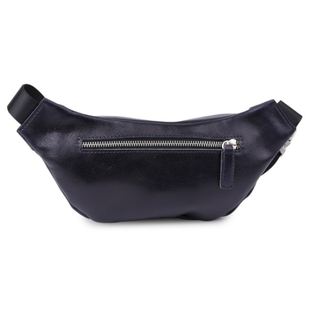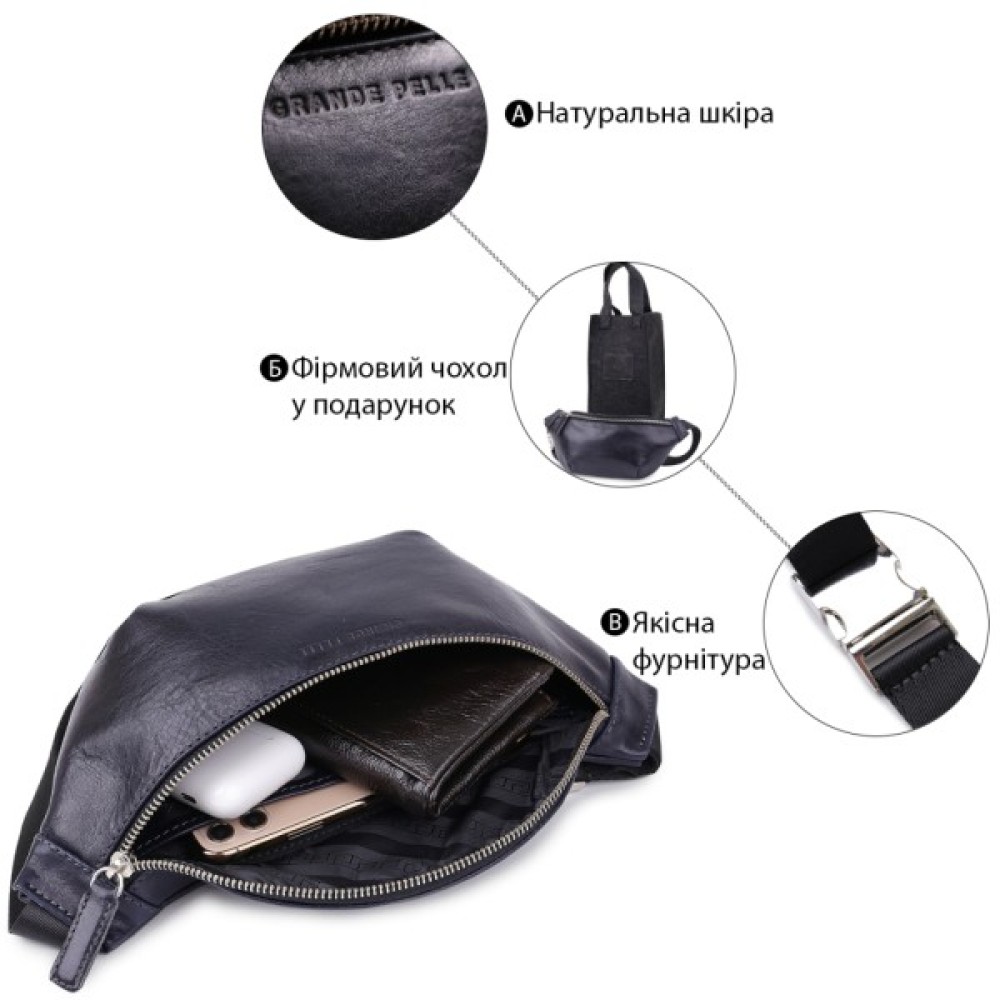 Добротна бананка унісекс з натуральної гладкої шкіри з підвищеною міцністю. Має універсальний чорний колір і глянсову фактуру. Усередині крім основного відділення передбачена потайна кишеня на блискавці. На тильній стороні також є кишеня на блискавці для швидкого доступу. Текстильний ремінь регулюється по довжині.