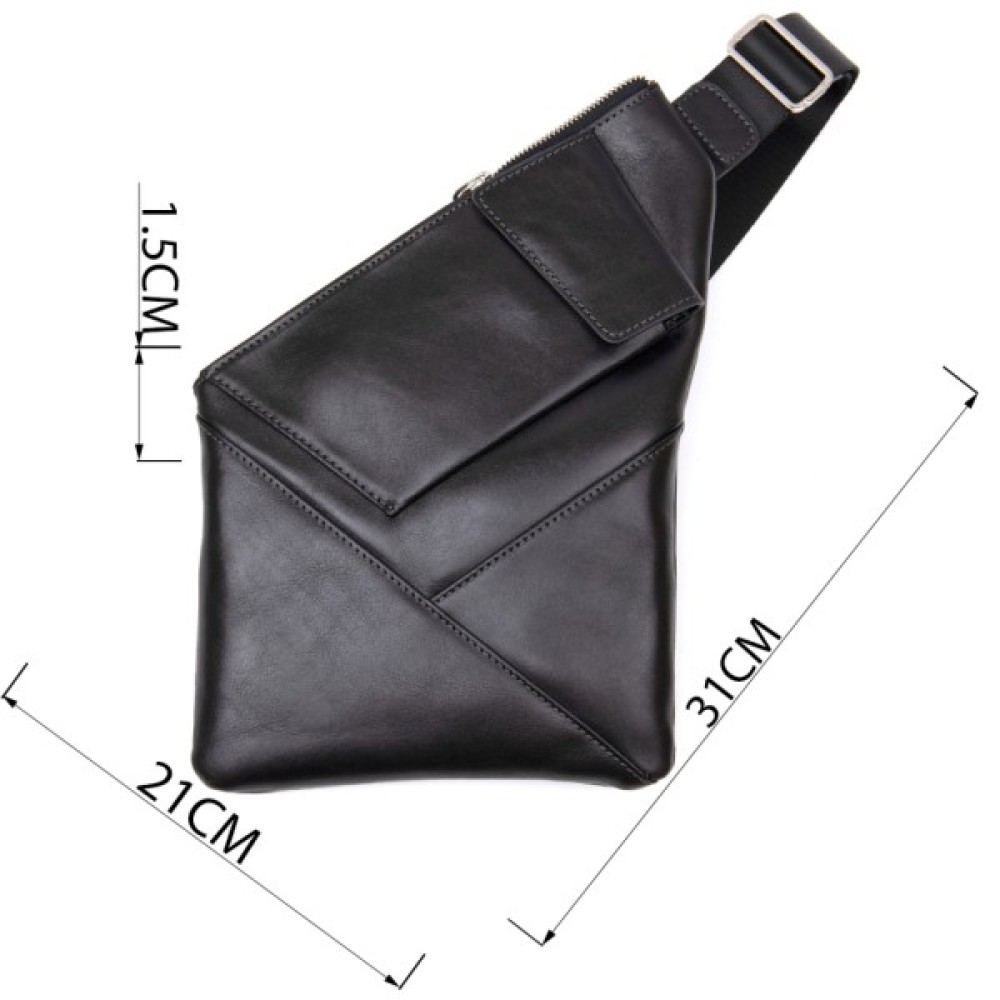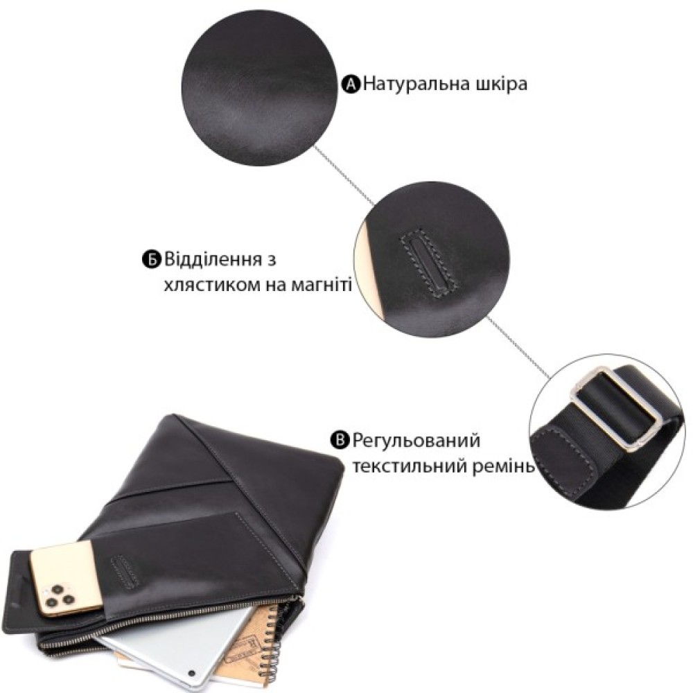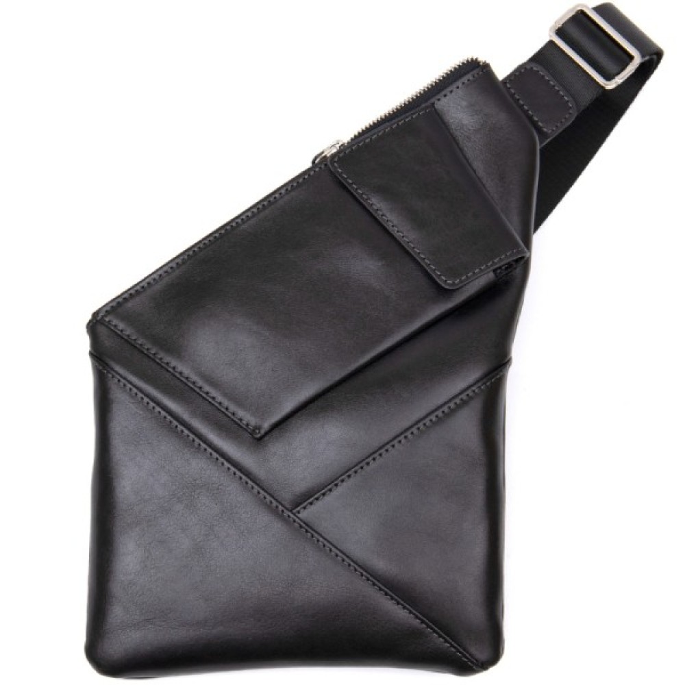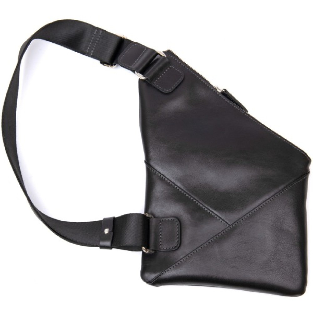 Цікава чоловіча сумка через плече нестандартної форми, яка дуже модна на сьогоднішній день. Виконана з міцної і зносостійкої натуральної шкіри. Колір чорний, фактура гладка і глянсова. Ремінь з міцного текстилю, його можна регулювати по довжині.