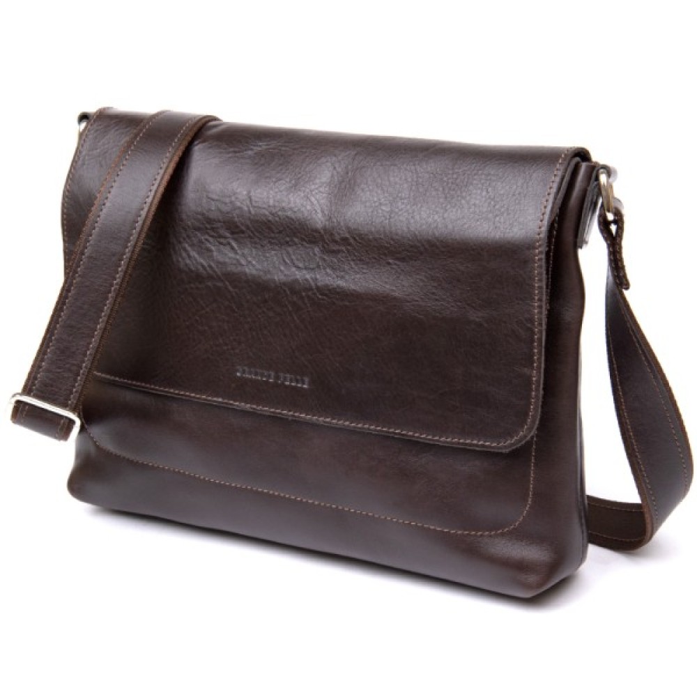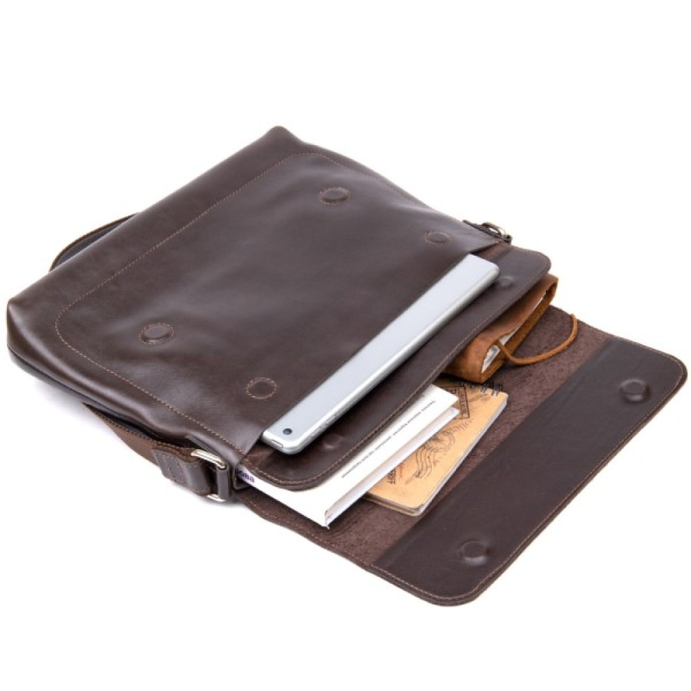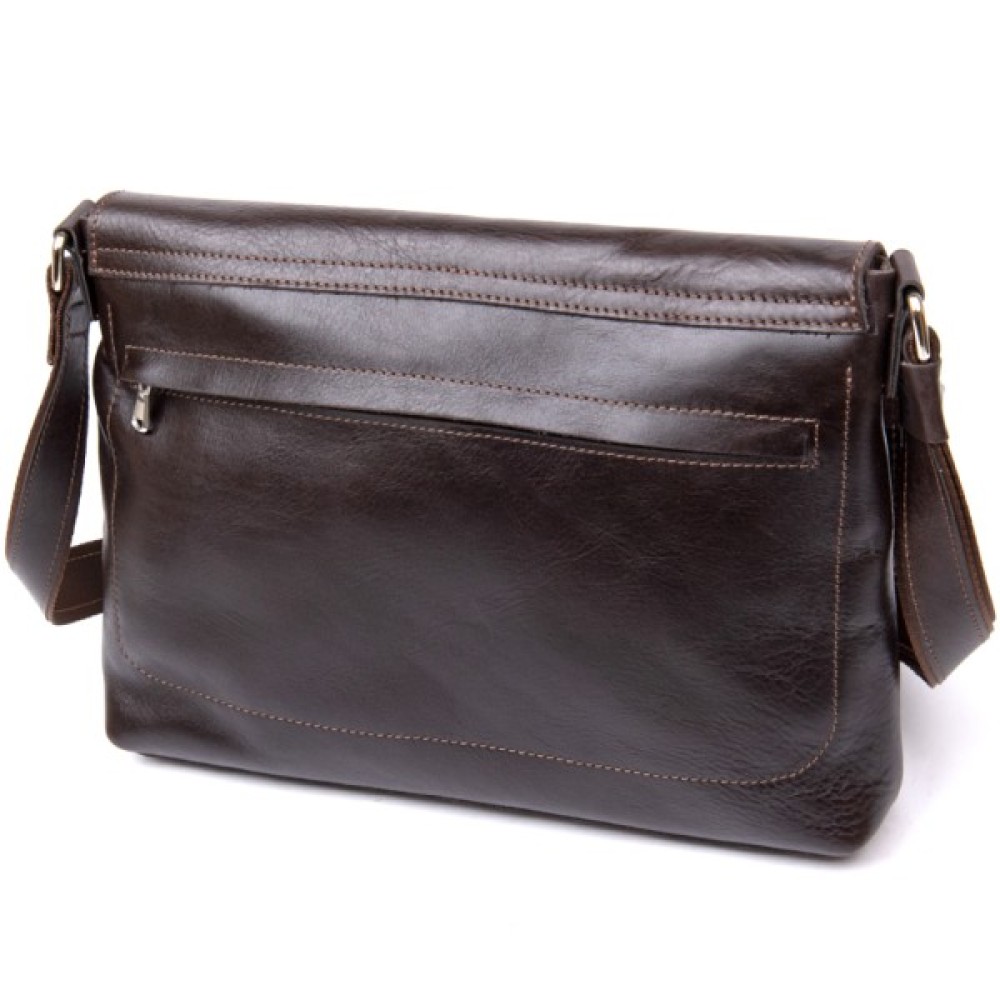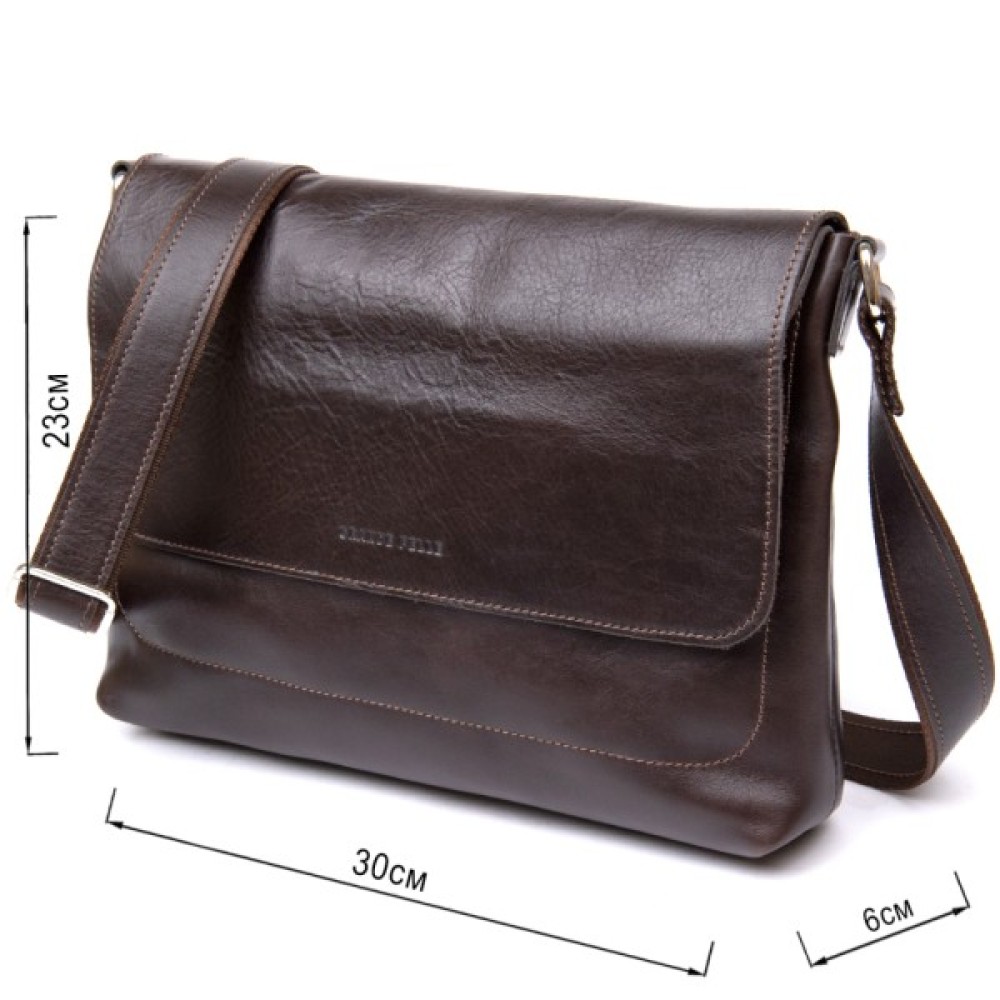 Прямокутна чоловіча сумка для чоловіків будь-якого віку. Виготовлена з зносостійкої натуральної шкіри коричневого кольору з шоколадним відтінком. Має красиву і гладку фактуру. Усередині помістяться документи, планшет, папери формату А4 та інше.