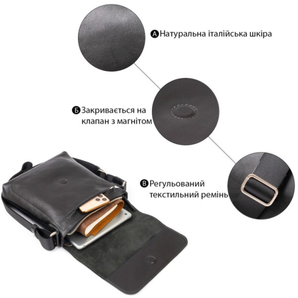 Впевнені, що саме деталі створюють загальне враження. В нашій сумці з натуральної шкіри продумана і підібрана кожна деталь: шкіра, дизайн, пошиття та фурнітура. Виріб має безліч різноманітних кишеньок для вашої зручності.