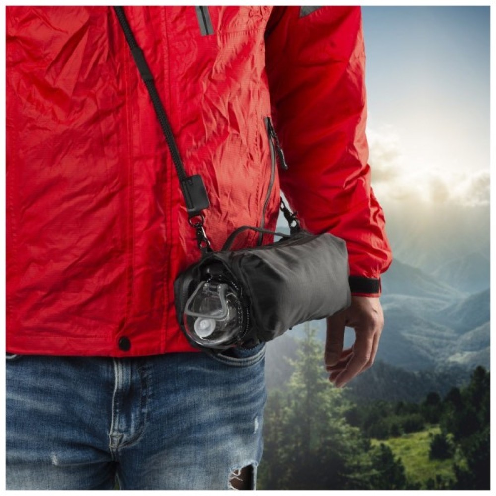 Сумка через плече Schwarzwolf Kailas – це компактна модель, призначена для найпотрібніших невеликих речей, пляшки або парасолі. Сумка містить дві основні кишені на блискавці. В одній – два невеликі відділення для кредитних карт і одна сітчаста кишеня. В іншій – два відділення для навушників та інших дрібниць і одна кишеня з карабіном. Центральна зона між основними кишенями щільно прилягає до гумового кріплення для утримання пляшки. Прогумовані боки не пропускають вологу в основне відділення, якщо туди покласти мокру парасольку. Шнур сумки знімний з карабінами. Може використовуватися як шнурок для телефону. Сумка виготовлена з переробленого поліестеру. Розміри моделі – 25 × 10 × 11 см. Вага – 165 г.