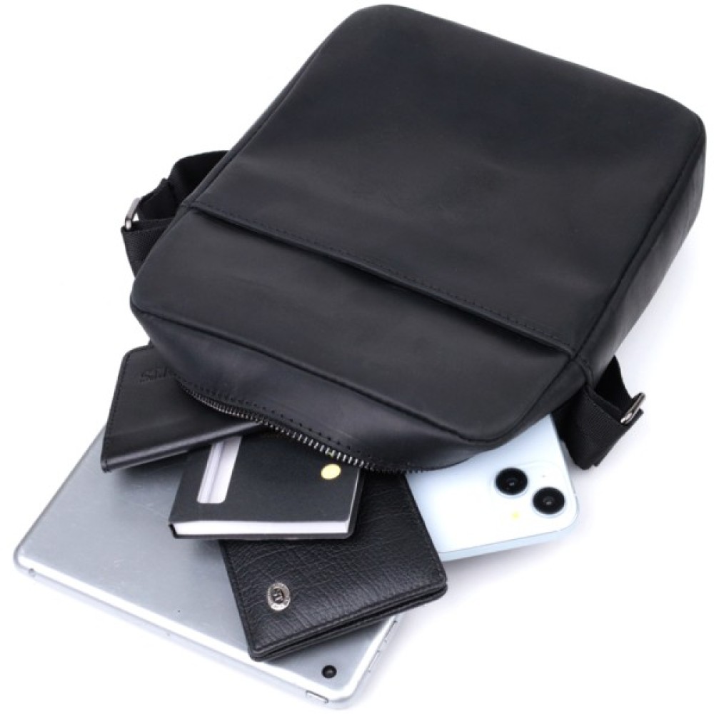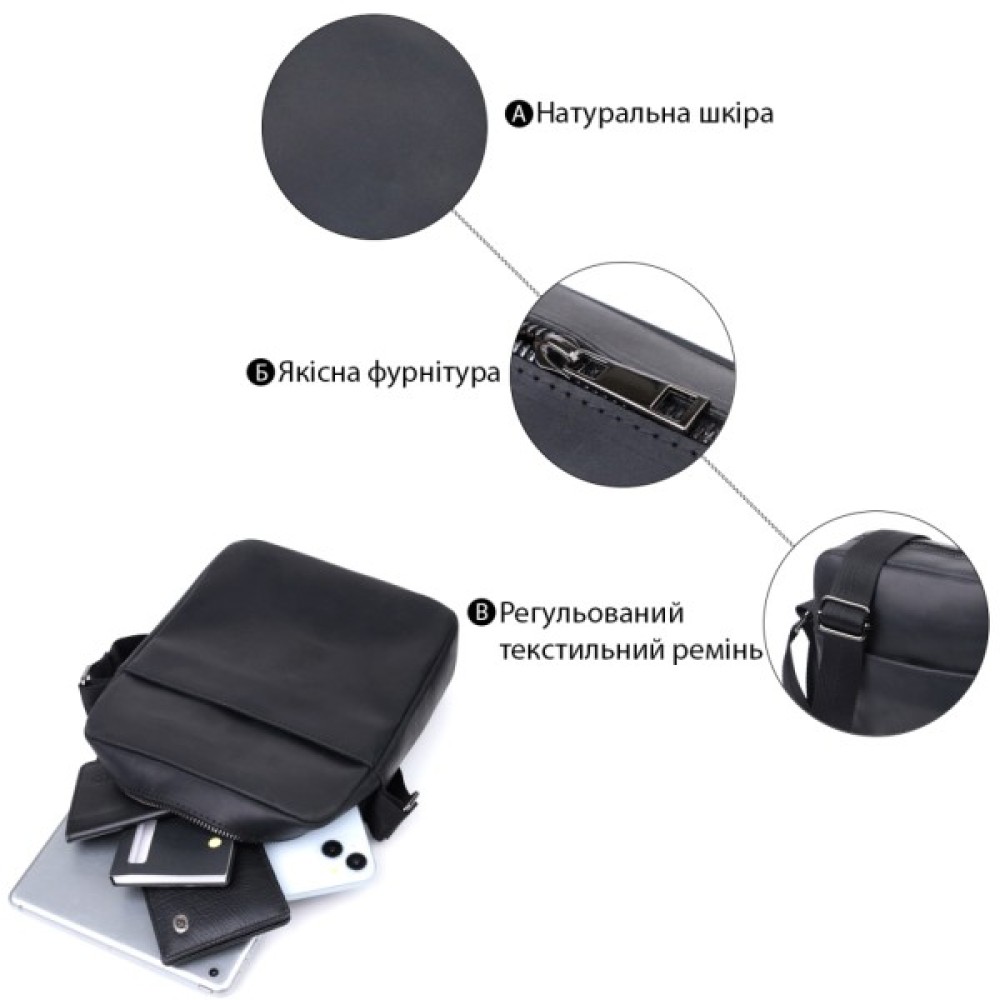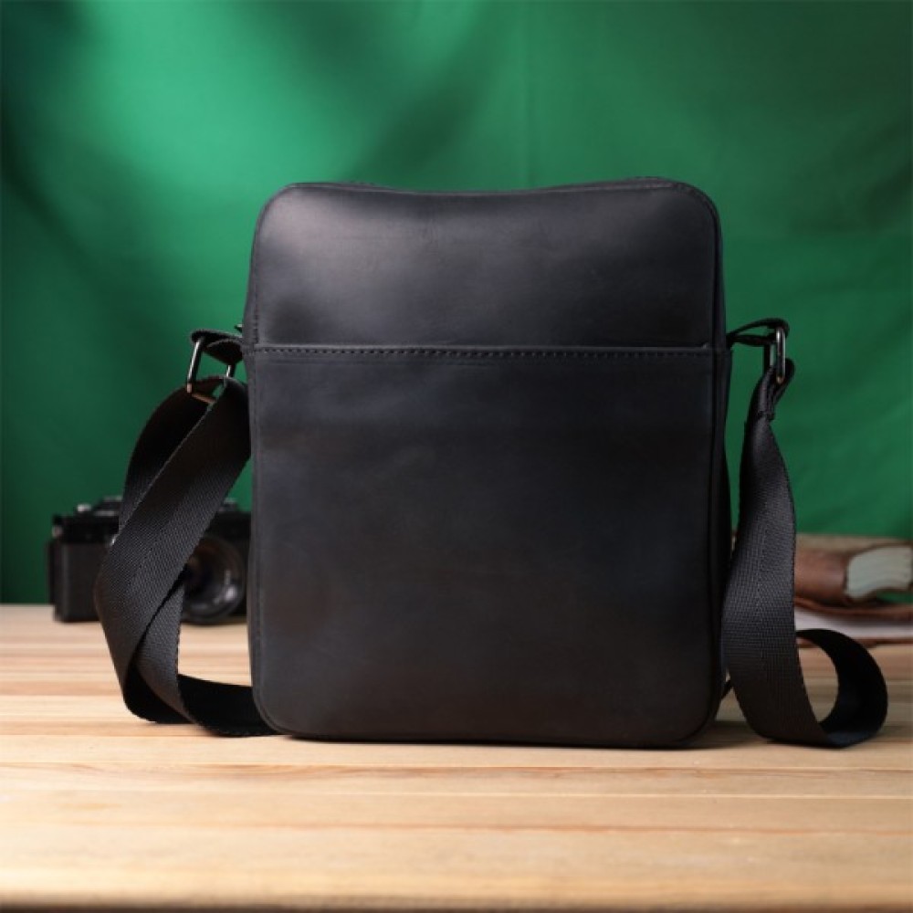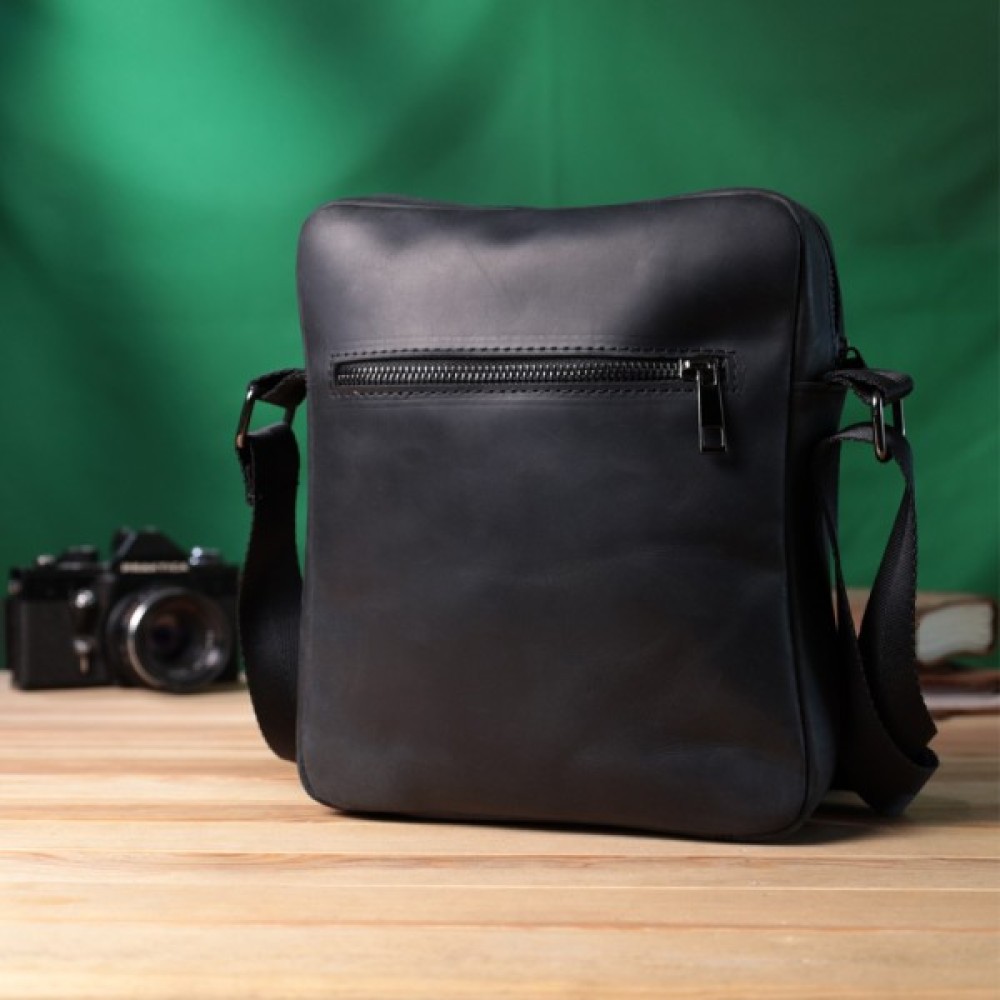Цікава чоловіча сумка месенджер із люксової шкіри Crazy Horse, яка виглядає зістареною – вічний антикварний та вінтажний вигляд. Вона має гладку матову поверхню, не блищить, згодом через знос така шкіра дряпатиметься і тертиметься, показуючи зміну колірного тону, що дійсно відображає вінтаж. Фурнітура металевого кольору - стійка, не змінює свій колір у процесі носіння. Аксесуар чудово поєднується з усіма стилями в одязі та може стати чудовим подарунком на будь-яке свято.