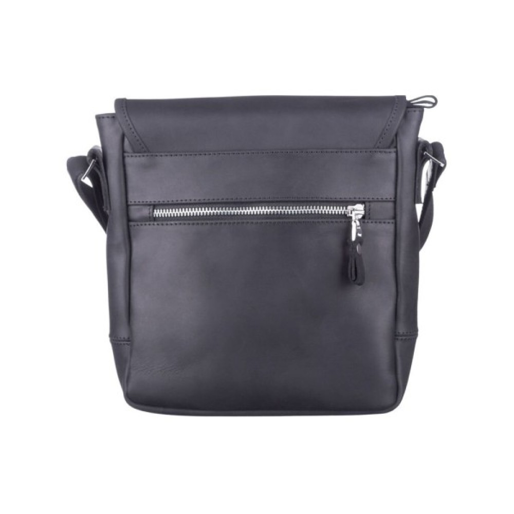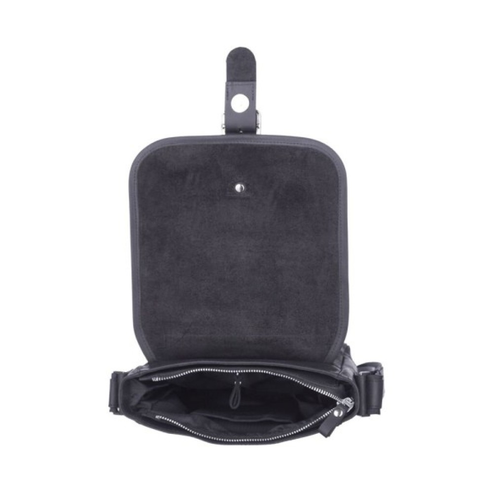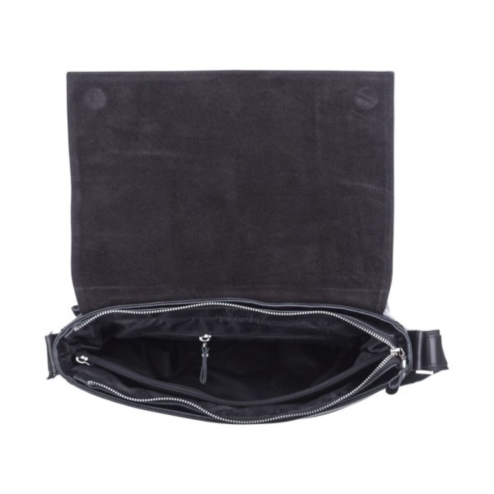 Ззаду на сумці розташований прорізний карман для дрібних речей. Закривається дана модель клапаном, обшитим по контуру міцною ниткою з декоративною пряжкою на магнітній кнопці.