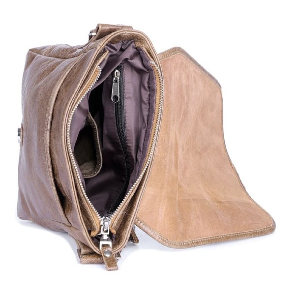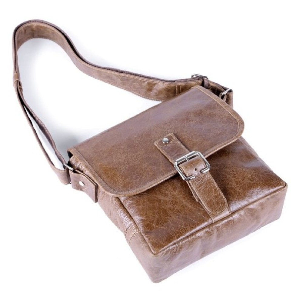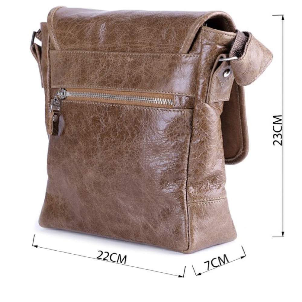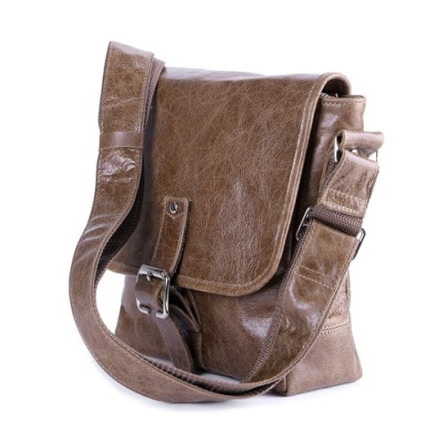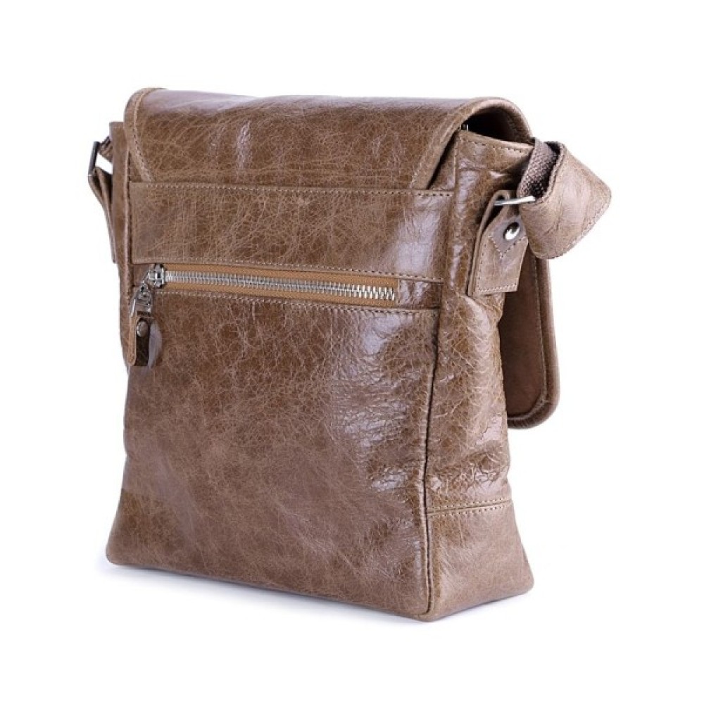 Високоякісна чоловіча сумка з натуральної вінтажної шкіри. Колір фурнітури: срібло. Сумка закривається за допомогою клапана на магнітній кнопці і металевої блискавки. Під клапаном розташована накладна кишеня. На задній зовнішній стороні аксесуара знаходиться невелике відділення на блискавці. Сумка носиться через плече за допомогою регульованого плечового ременя. Підкладка виконана з міцного текстильного матеріалу.