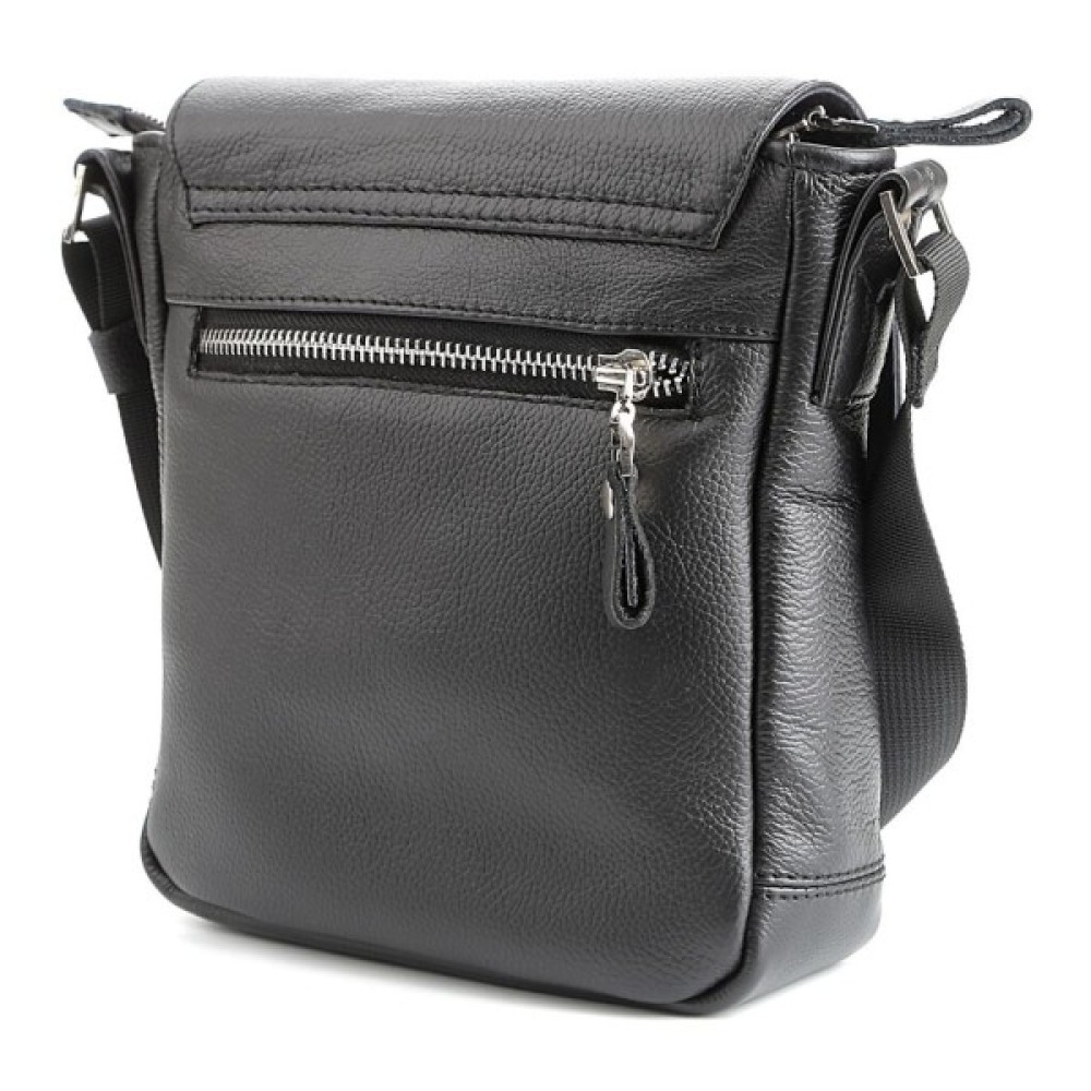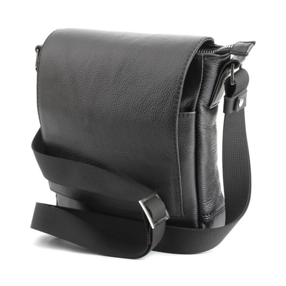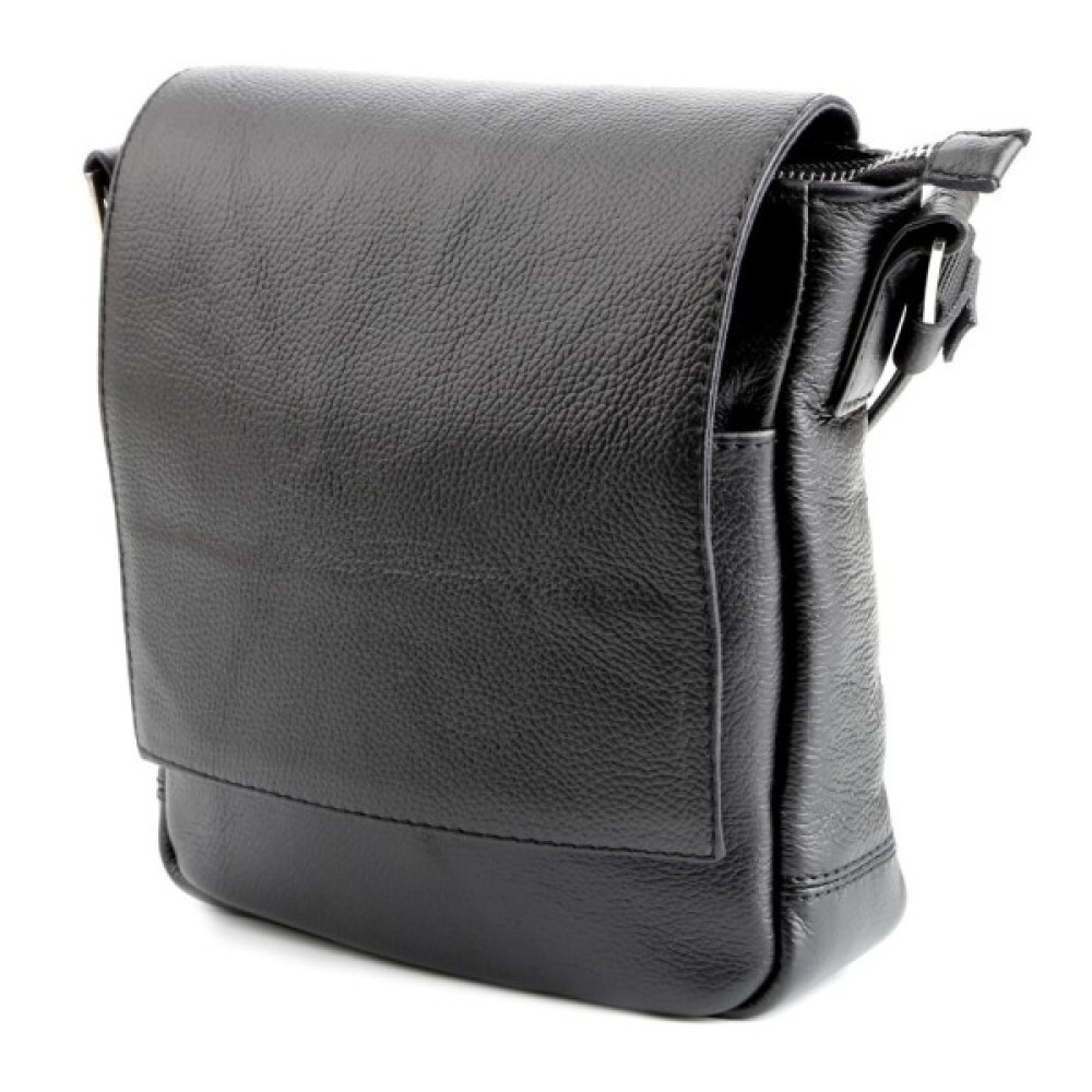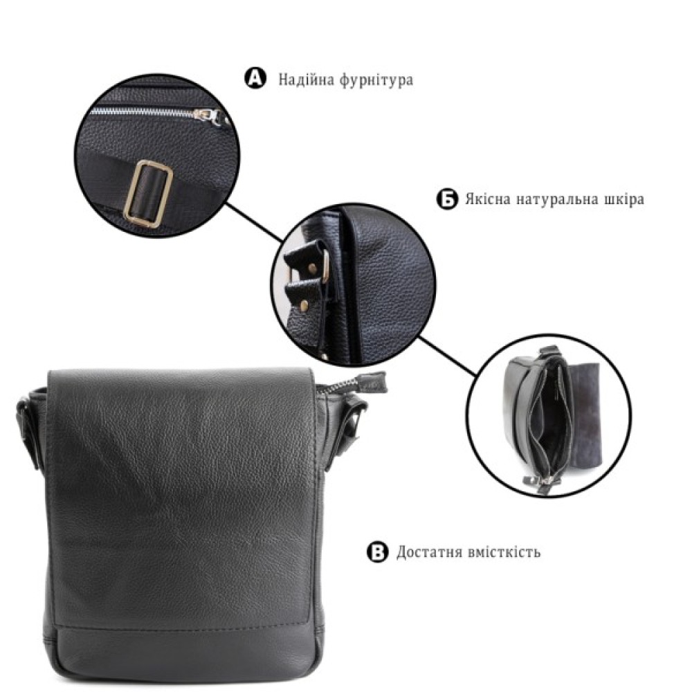 Компактна чоловіча шкіряна сумка через плече українського виробництва. Шкіра, з якої виконаний цей аксесуар, приємна на дотик і має зернисту фактуру.