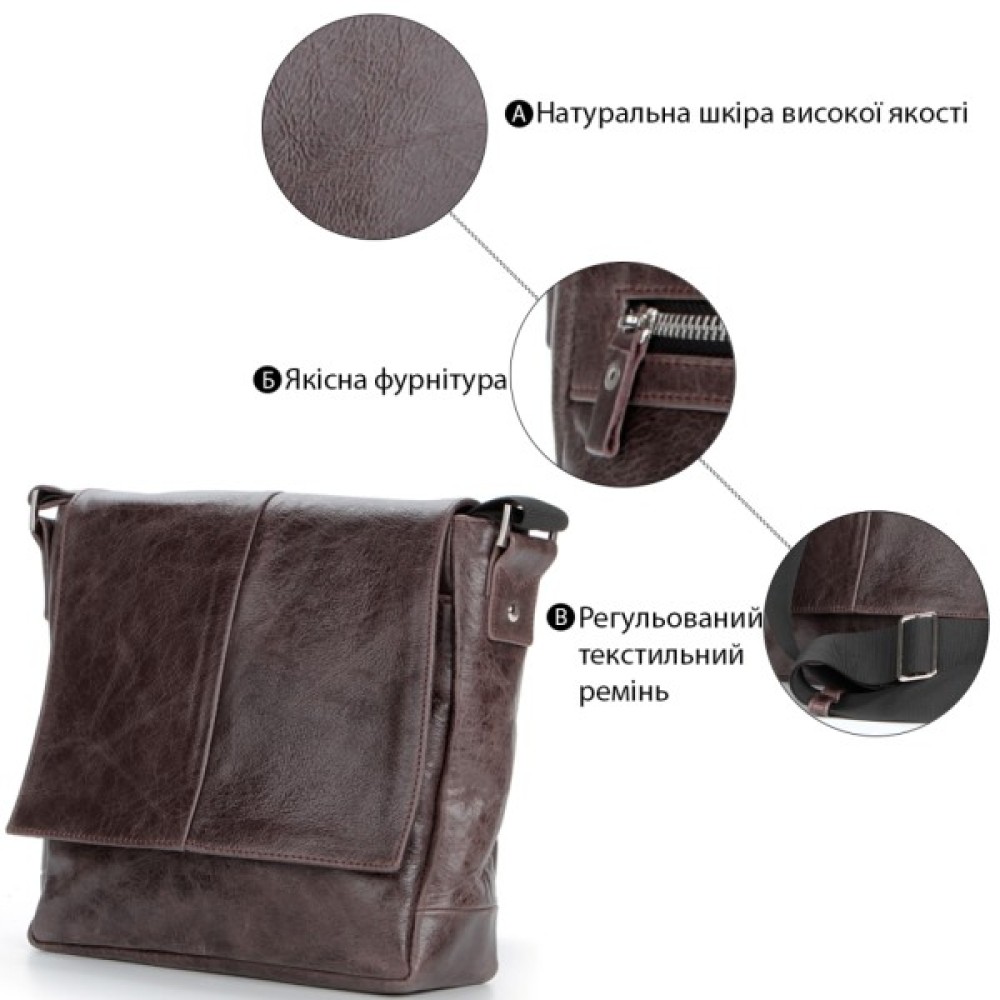Якщо Вам подобаються вінтажні речі з міцної шкіри з цікавою фактурою, то ця сумка доведеться Вам до душі. Вона має просту форму з клапаном і не обтяжена зайвими деталями, проте дуже практична і функціональна.