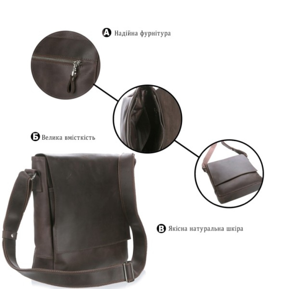 Красива чоловіча сумка вертикального формату з натуральної міцної шкіри. Цим аксесуаром легко підкреслити свою особливість і неповторність, адже ця сумка виконана за допомогою ручної роботи і є ексклюзивним виробом. Крім іншого, аксесуар стійкий до пошкоджень і потертостей, тому дуже довго не втрачає новизни зовнішнього вигляду.