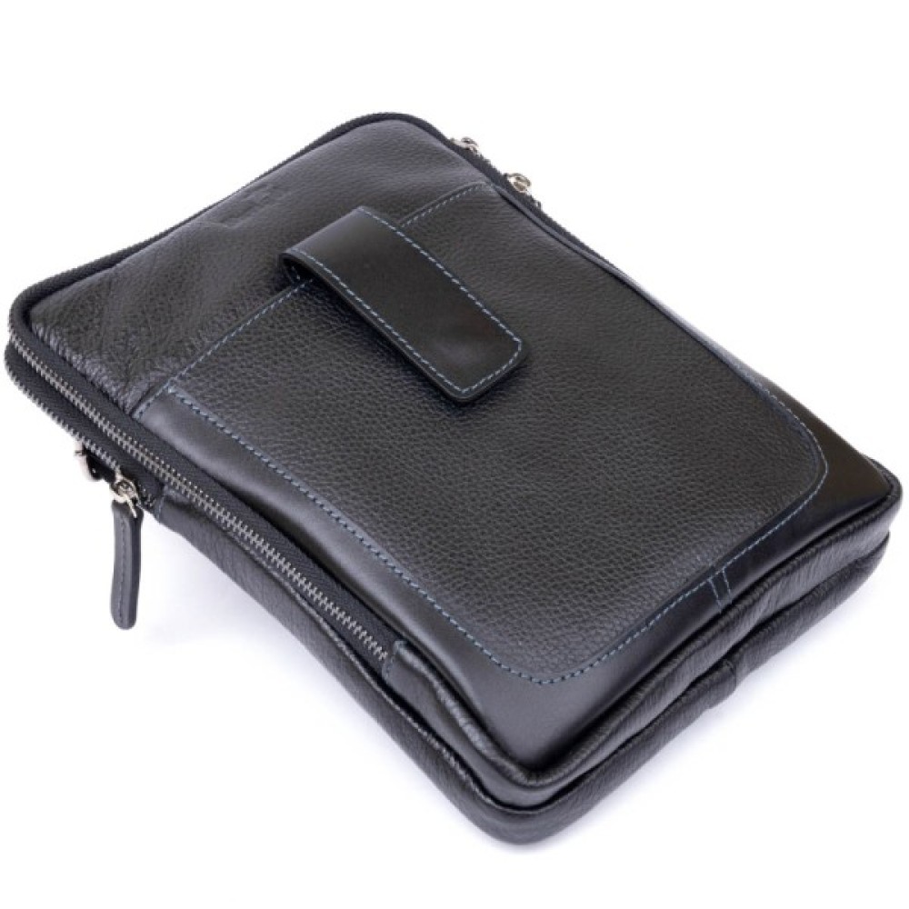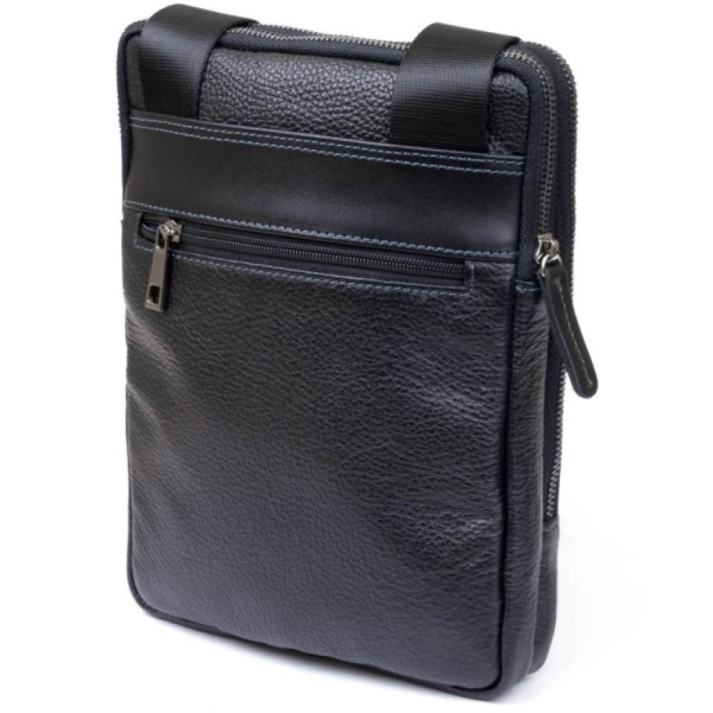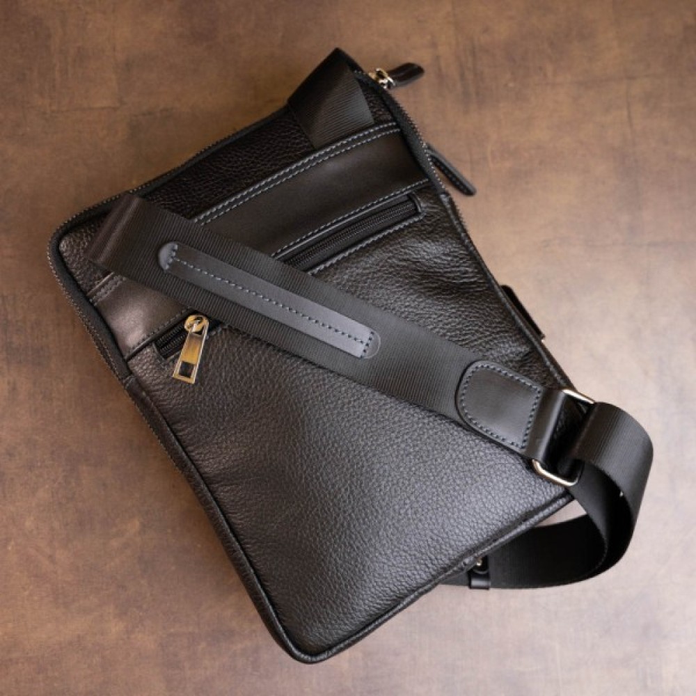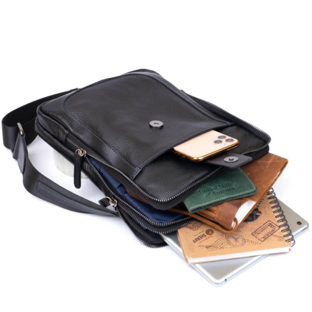 Практична сумка в зернистій шкірі "флотар" на два відділення. Модель в класичному чорному кольорі. Виробництво - Україна. Найвища якість виконання. Міцна фурнітура та якісні матеріали. Зерниста шкіра зовсім невибаглива в догляді. Довго служить і залишається в ідеальному вигляді. На виробах з зернистої шкіри менше видно подряпини і потертості. Чоловічий планшет - кращий варіант сумки на кожен день і для зустрічей. У дизайні моделі немає ніяких зайвих деталей при цьому сумка виглядає дуже модно і стильно. На лицьовій стороні моделі тиснення у вигляді логотипу бренду. Сумка доповнена вставками з гладкої шкіри з боків і хлястик на лицьовій стороні, що підкреслить її індивідуальний і продуманий дизайн, а вам в свою чергу додасть впевненості і солідності. Аксесуар доповнено текстильним незнімним ремінцем на плече. Шкіряна сумка - кращий подарунок для будь-якого чоловіка. Якщо ви хочете таку ж модель в коричневому кольорі - код для пошуку 11286, в вінтажній шкірі - 11285.