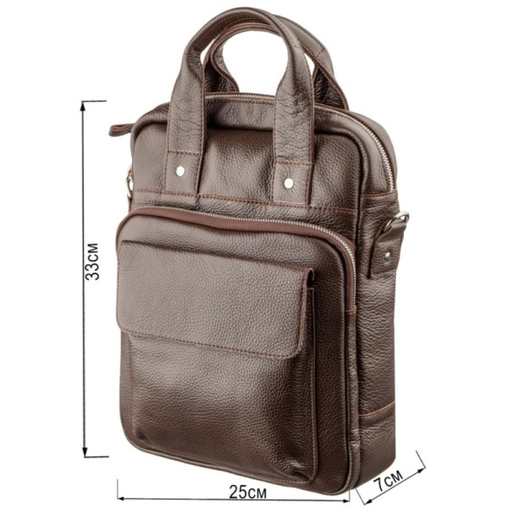 Всередині сумки якісна текстильна підкладка коричневого кольору. Вся фурнітура сріблястого кольору. Якщо ви в пошуках подарунка для чоловіка, подаруйте йому сумку з натуральної шкіри. Класичний дизайн і висока якість, безсумнівно, порадують власника такого подарунка.