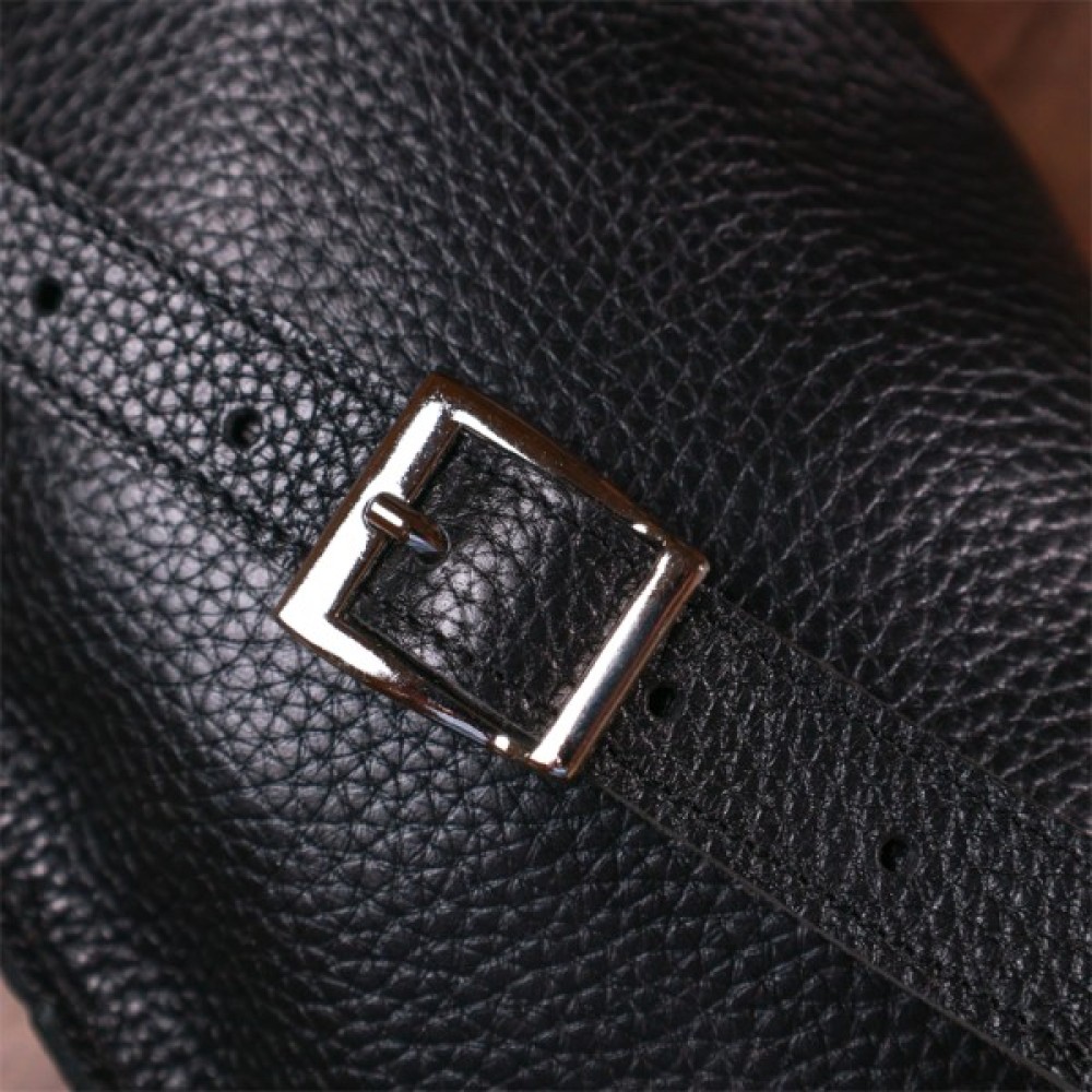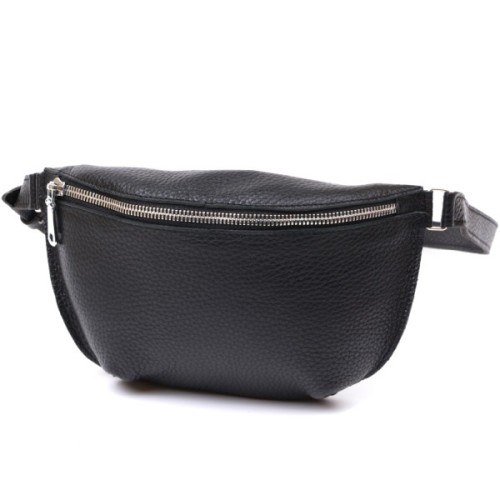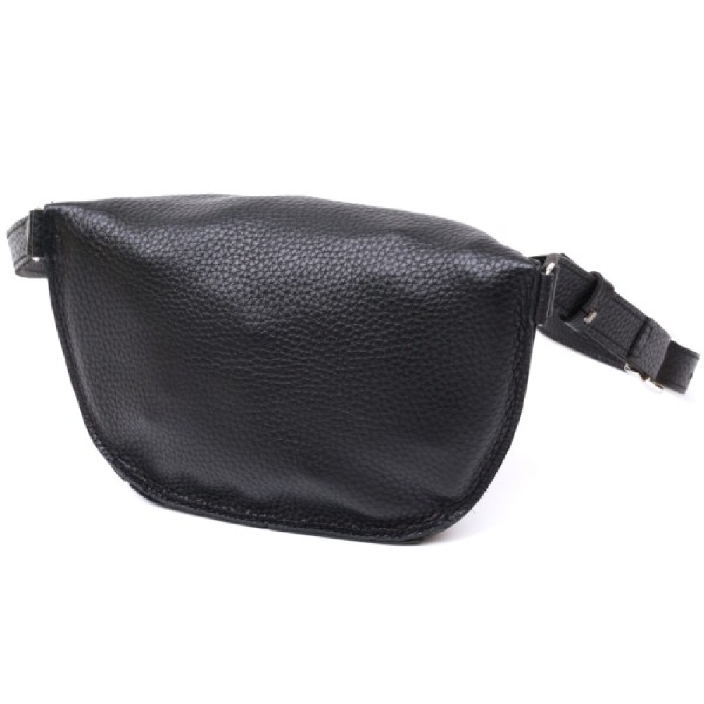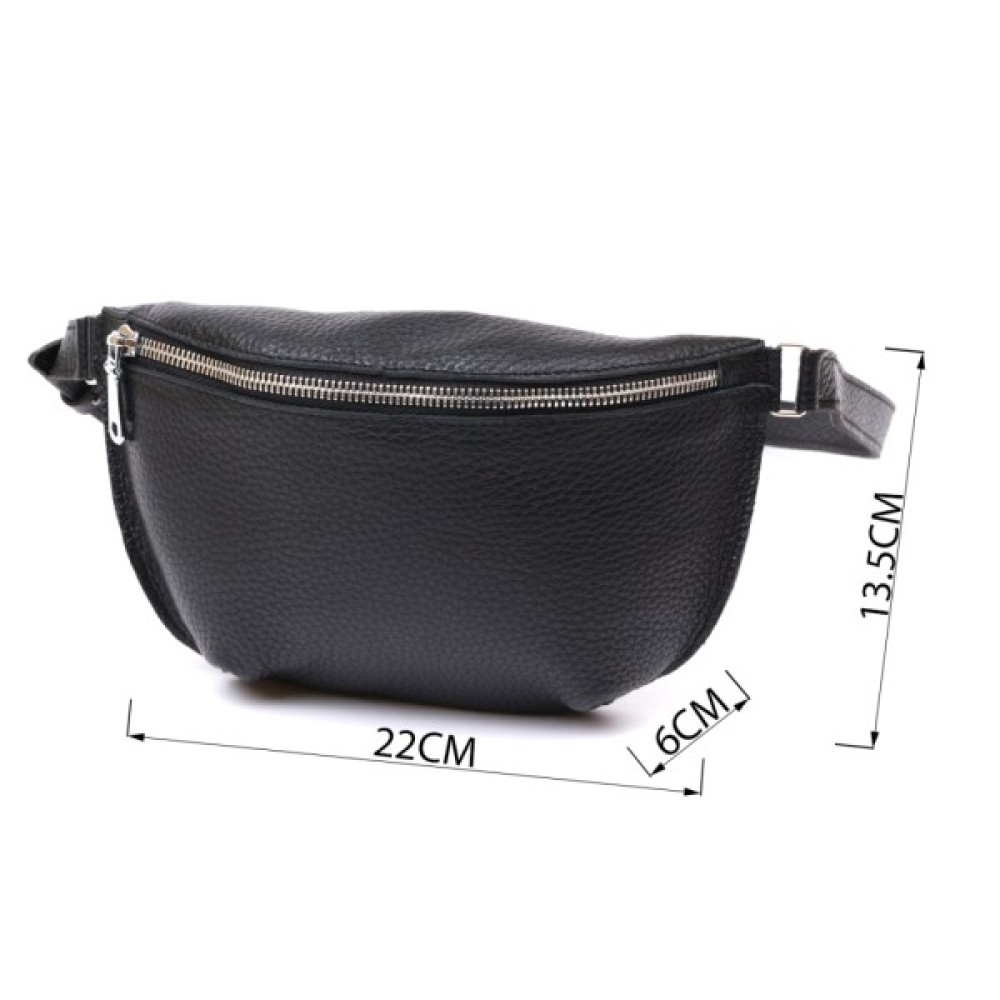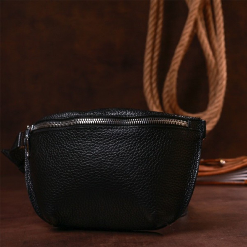 Чудова жіноча сумка на пояс у строгому та лаконічному дизайні. Виконано цю модель з натуральної шкіри високої якості, що видно навіть неозброєним оком. Колір виробу — універсальний чорний, що практично для щоденного використання. Фактура — м'яка зерниста. Для зручності передбачена можливість регулювання пояса відповідно до фігури.