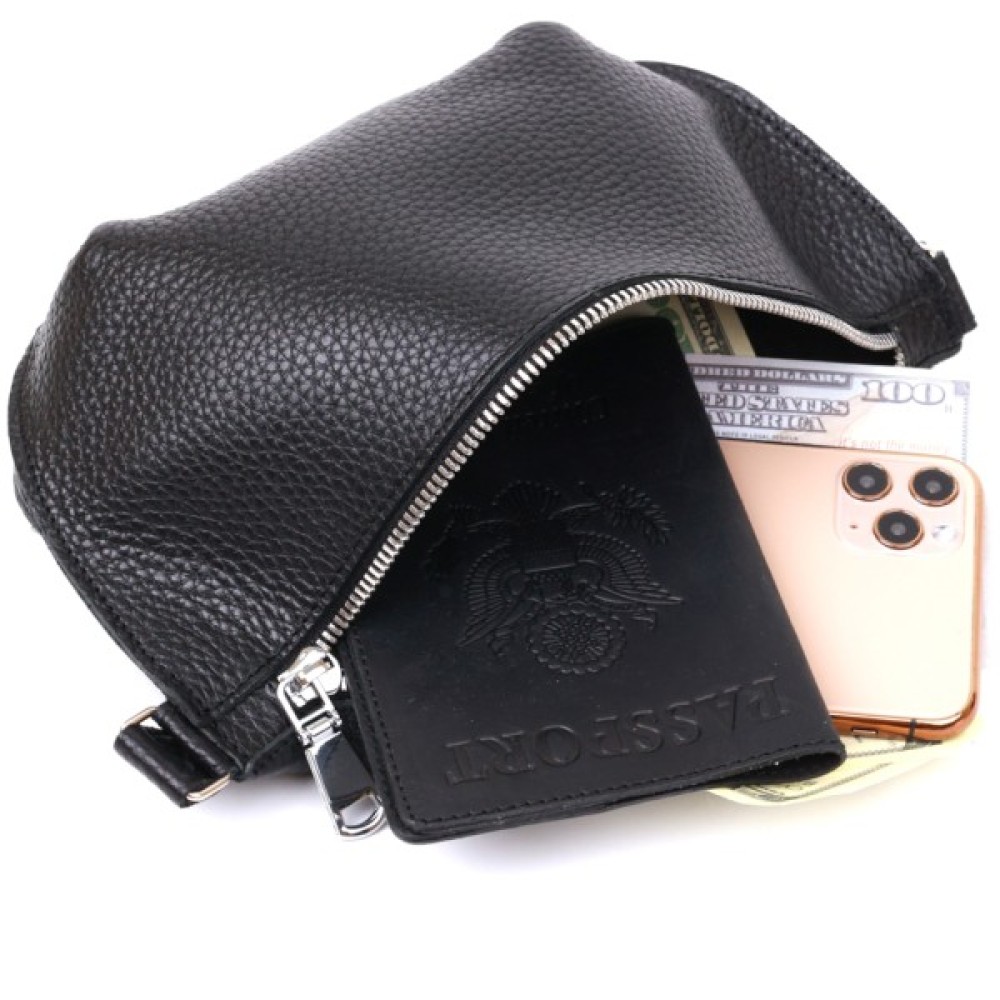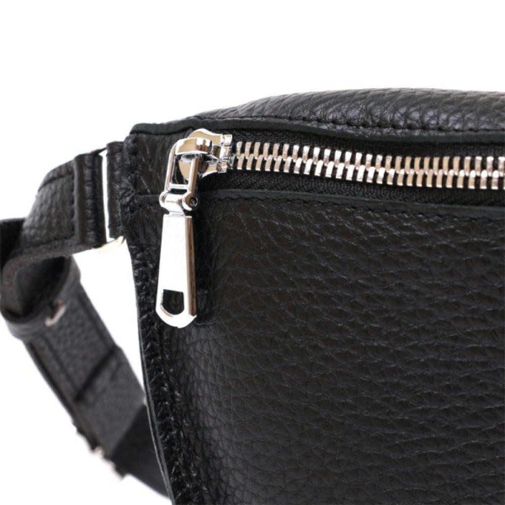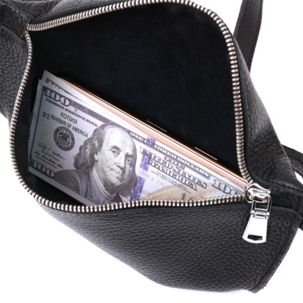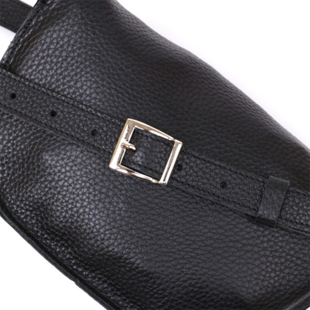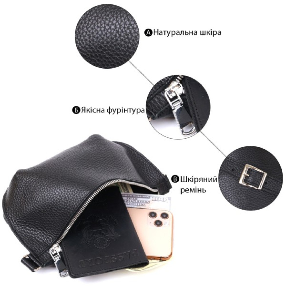 Чудова жіноча сумка на пояс у строгому та лаконічному дизайні. Виконано цю модель з натуральної шкіри високої якості, що видно навіть неозброєним оком. Колір виробу — універсальний чорний, що практично для щоденного використання. Фактура — м'яка зерниста. Для зручності передбачена можливість регулювання пояса відповідно до фігури.