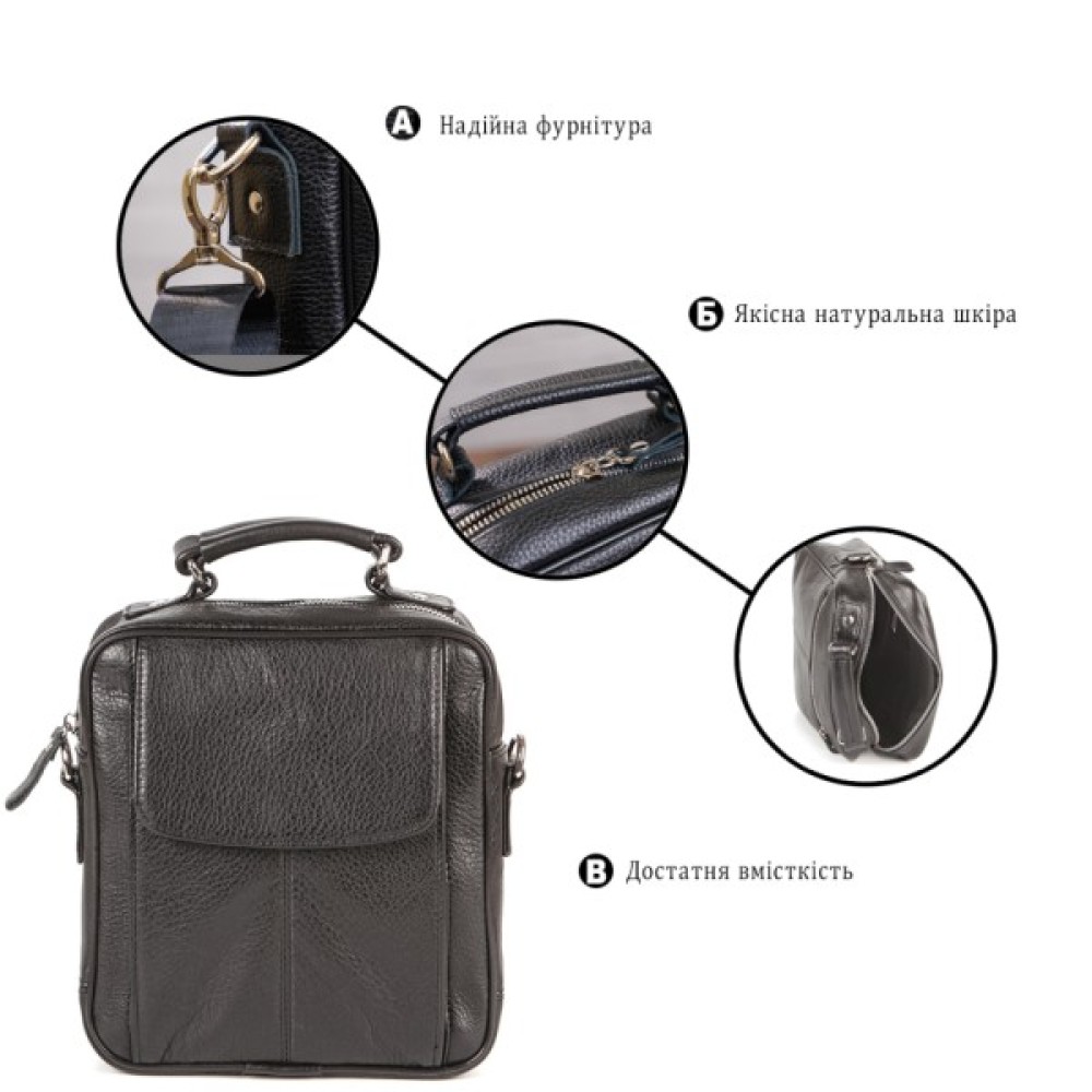 Оригінальна сумка з міцної зносостійкої шкіри, якої, можливо, не вистачає саме Вам для створення модного образу. Сумка має невеликі розміри, при цьому поміщає все необхідне для чоловіка на кожен день. У ній знайдеться місце для телефону, планшету, гаманця, зарядки та іншим необхідним речам.