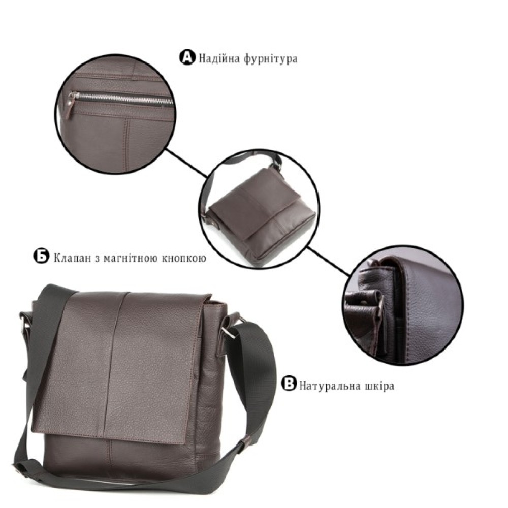Дуже красива сумочка ручної роботи коричневого кольору з натуральної шкіри. Аксесуар виглядає елегантно і може з легкістю доповнити як чоловічий костюм, так і повсякденне вбрання.