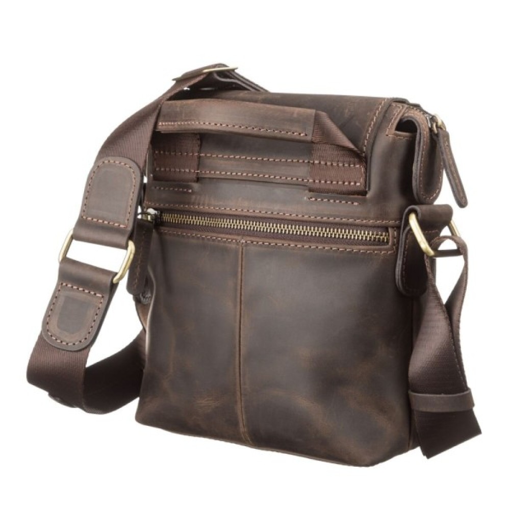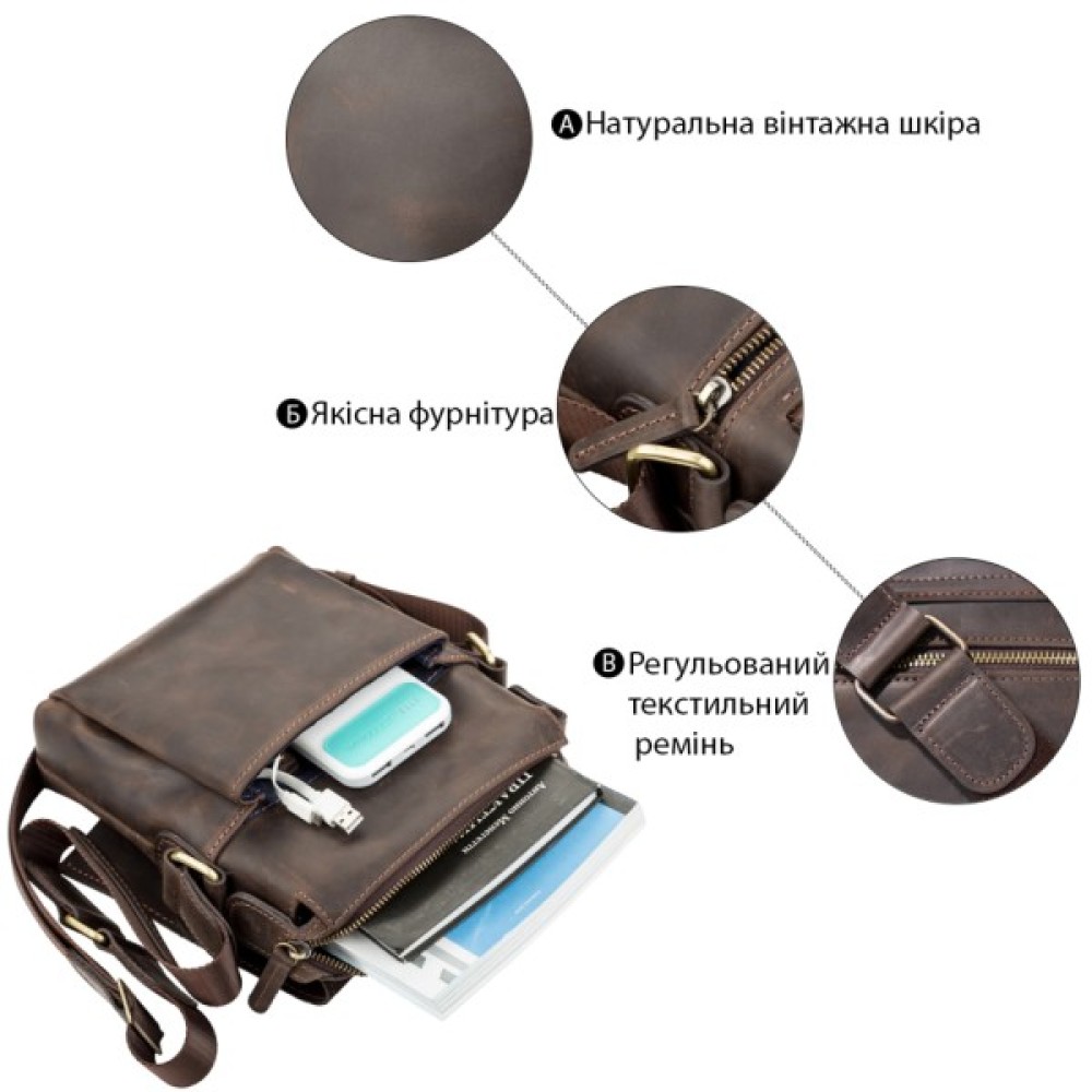 Чоловіча шкіряна сумка невеликого розміру з клапаном. Аксесуар виконаний з натуральної вінтажної шкіри, характерними ознаками якої є: неоднорідність забарвлення і потертості, які надають виробу вишуканого, індивідуального вигляду.