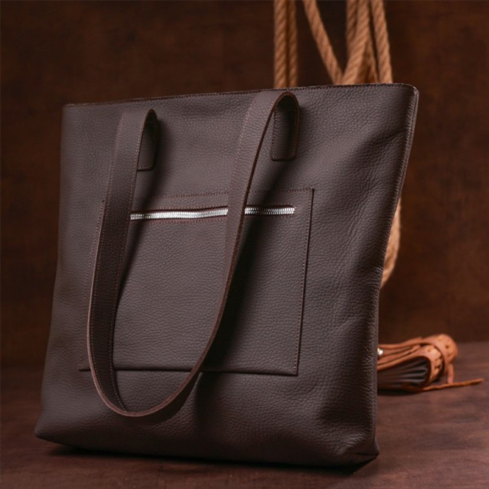 Чудова сумка для жінок, які віддають перевагу просторим та містким аксесуарам. Колір цієї моделі - матовий коричневий, фактура - зерниста і дуже приємна на дотик. Виконано сумку з високоякісної натуральної шкіри з відмінними характеристиками. Основне відділення закривається на блискавку. На зовнішній стороні є невелика кишеня на блискавці для швидкого доступу до її вмісту.