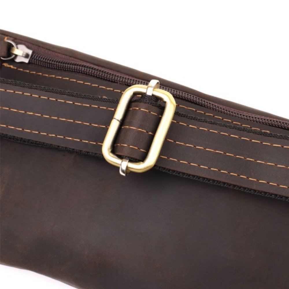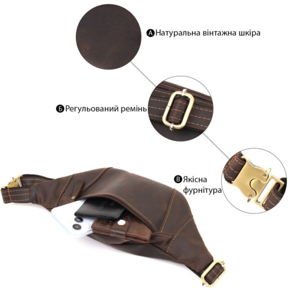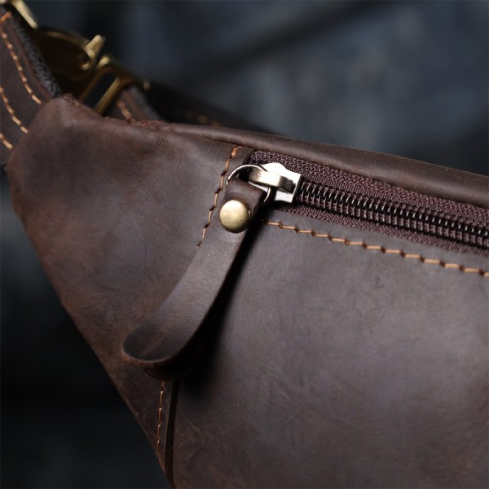 Виконана з міцної натуральної вінтажної шкіри, доповнена надійною металевою фурнітурою та регульованим ременем.